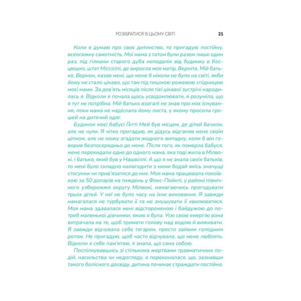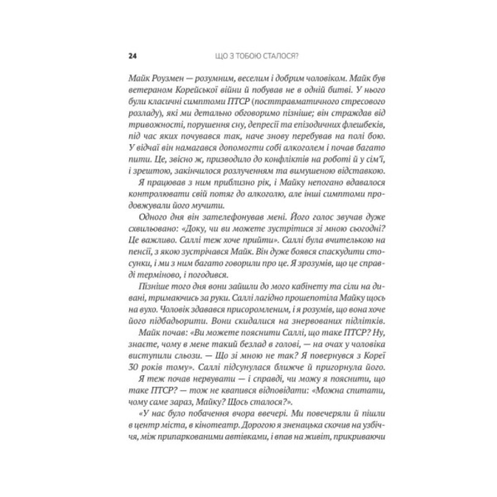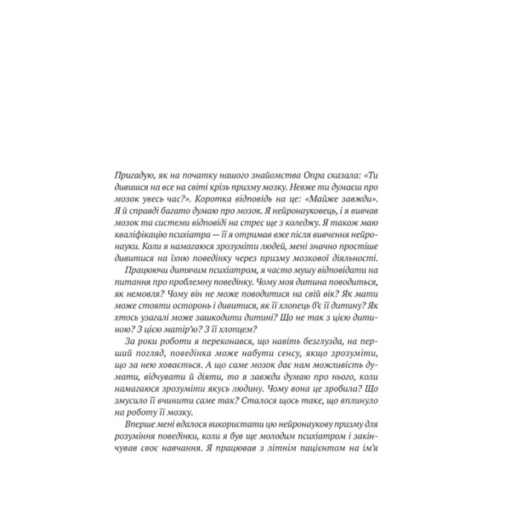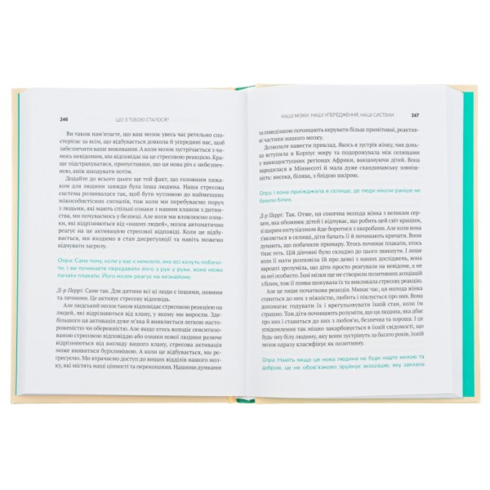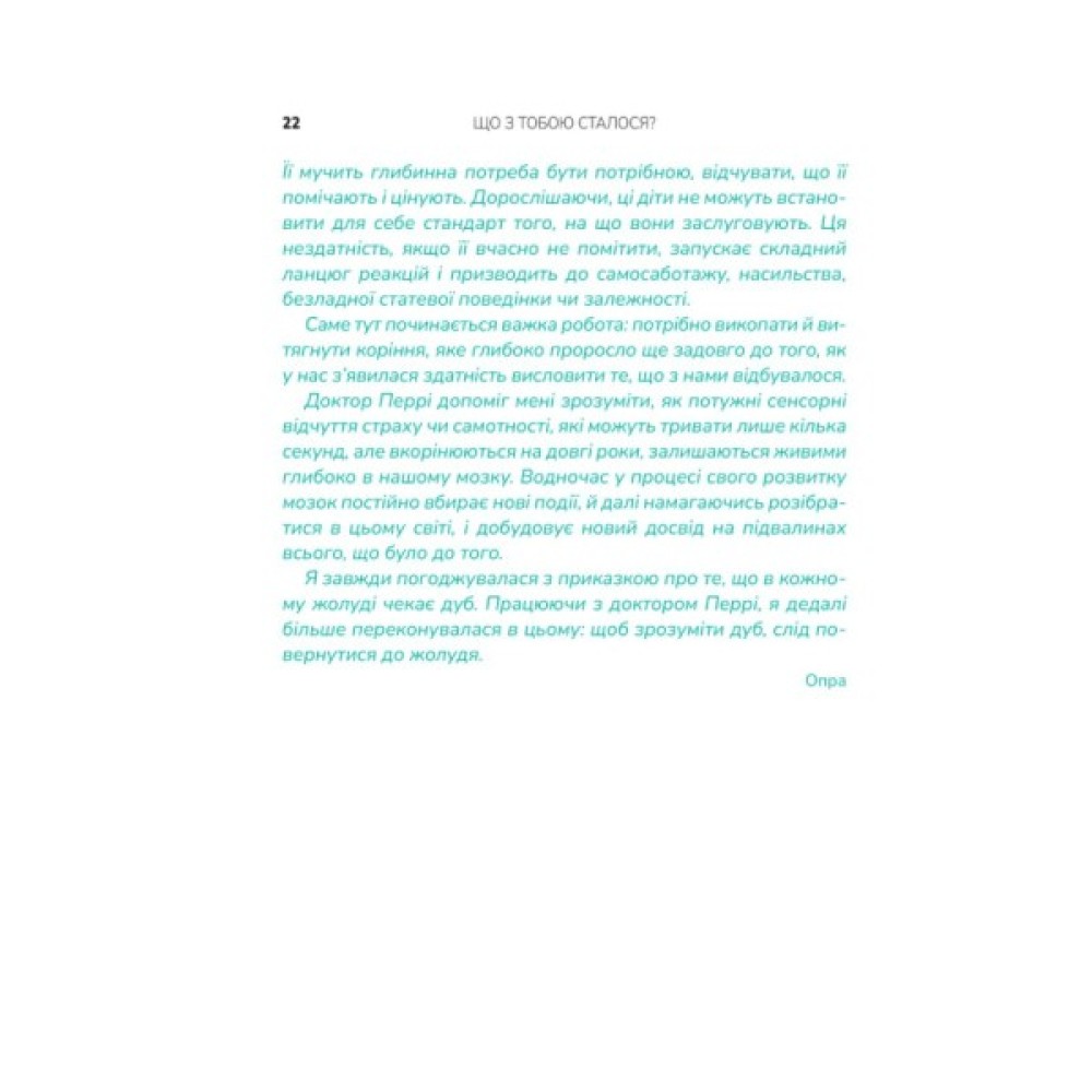 Мати, яка казала: «Ліпше б я зробила аборт». Батько-пияк, що мав важку руку. Вагітна в чотирнадцять, як Опра Вінфрі… від ґвалтівника? Ви сушите голову: «Що зі мною не так?». Натомість поставте собі питання: «Що зі мною сталося?». Глибокий аналіз травм минулого, негативних патернів і спогадів — спільна робота Опри та психіатра Брюса Перрі. Це щира розмова, під час якої ви плакатимете: від болю, що поступово стихатиме, від жахливих спогадів, що стиратимуться з пам’яті, і від щасливого відчуття крил на злеті...