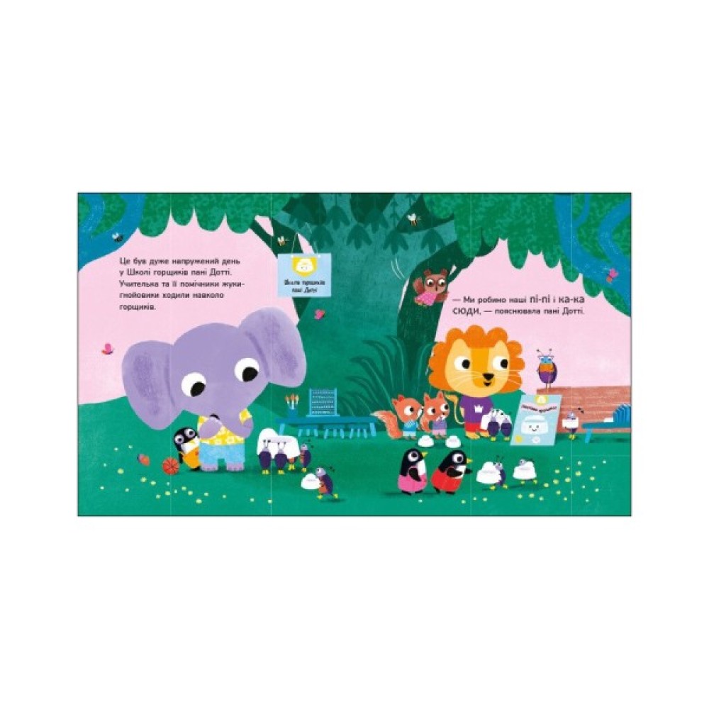 Час привчатися до горщика — і вчителька пані Дотті поспішає на допомогу! Долучайтеся до її класу. Звірятка вже прощаються із підгузками та вчаться любити свої горщики. Сповнена пі-пі та ка-ка, ця книжка ідеально підходить для малюків, які вчаться користуватися горщиками.