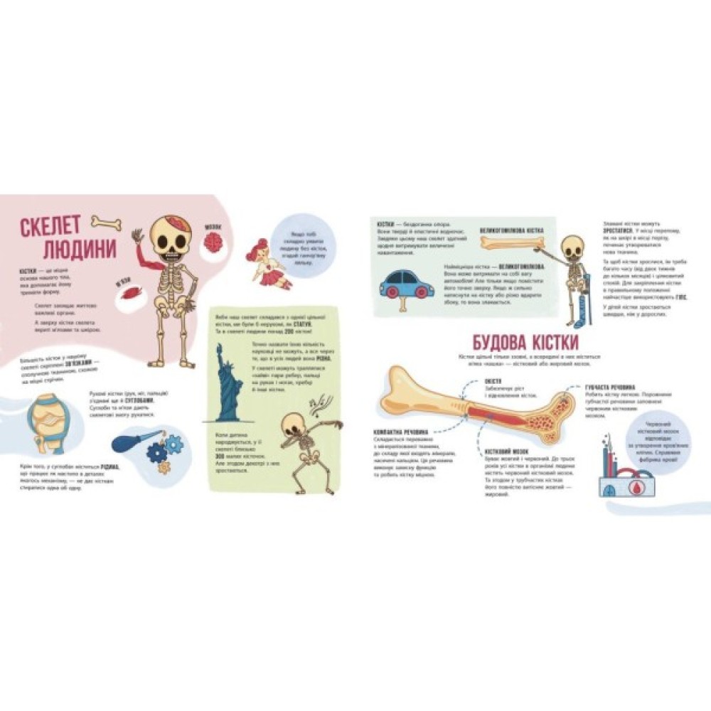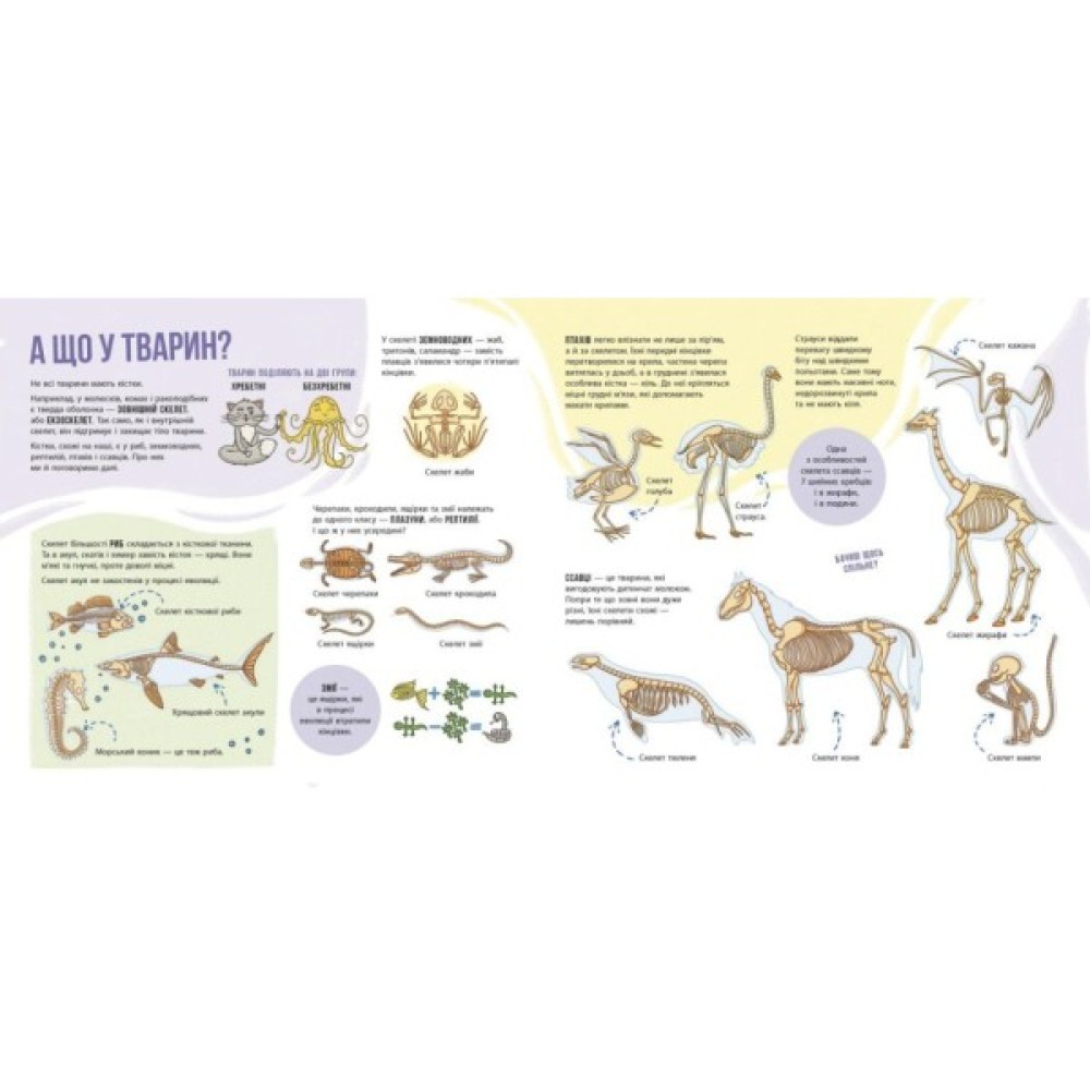 «Скелети і кістки» – це страшенно цікава енциклопедія-розкладайка про черепи, щелепи, хребці, фаланги, зуби й дзьоби. Тут спраглі до знань читачі дізнаються безліч «кістлявих» фактів, зокрема: а) що спільного в скелетах усіх ссавців; б) чим роги відрізняються від кісток; в) як за кістками вивчають історію. І це далеко не все! На величенних розгортах діти віч-на-віч зустрінуться з китами й динозаврами, носорогами й кентаврами… А зазираючи у віконце за віконцем, побачать їх по-особливому – у вигляді скелетів і кісток.