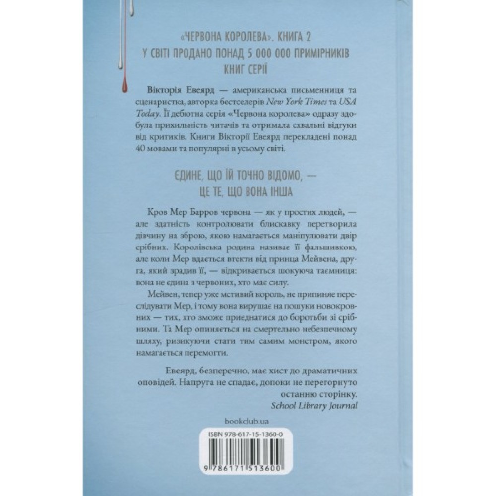 Кров Мер Барров червона — як у простих людей, — але здатність контролювати блискавку перетворила її на зброю, якою намагається маніпулювати двір срібних. Королівська родина називає її фальшивкою, але коли Мер вдається втекти від принца Мейвена, друга, який зрадив її, — відкривається шокуюча таємниця: вона не єдина зі свого роду, хто має силу.