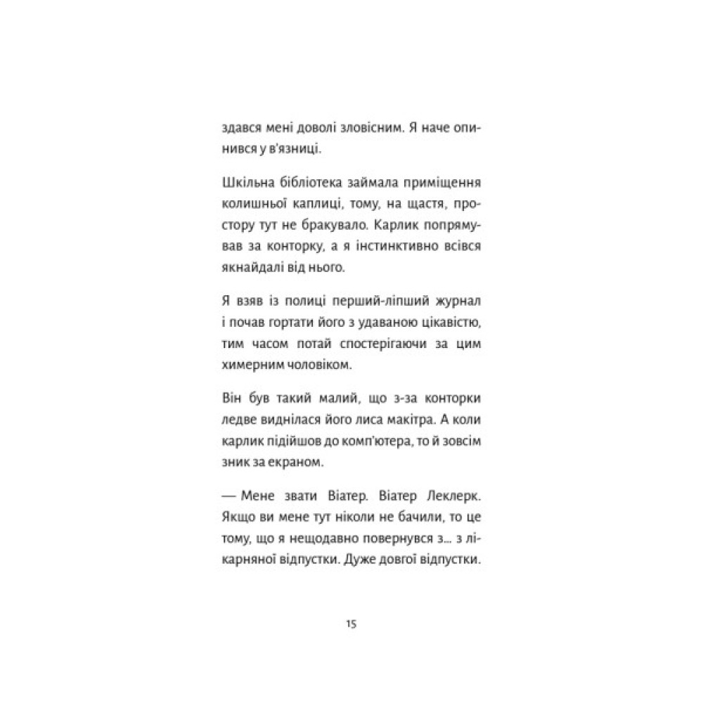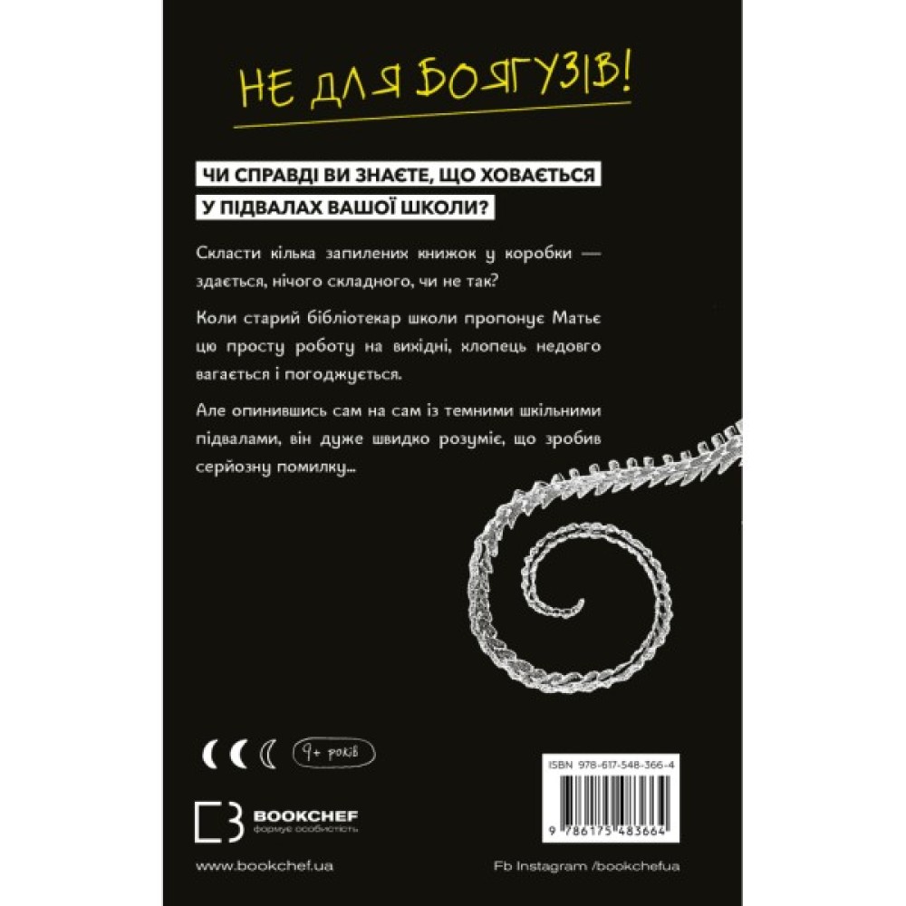 Матьє — звичайний школяр, який опиняється у шкільній бібліотеці. Але це не просте місце, а портал у світ таємниць і небезпек, прихованих у найстарішій частині школи. Його гід у цьому загадковому просторі — дивний бібліотекар Віатер Леклерк. Старі книги, запилюжений підвал і моторошні експонати перетворюються на пастку, з якої неможливо вибратися. Кожна сторінка захоплює читача у вир страху та загадок, а кожен поворот сюжету відкриває нові деталі, які змушують задуматися: наскільки небезпечними можуть бути секрети минулого?