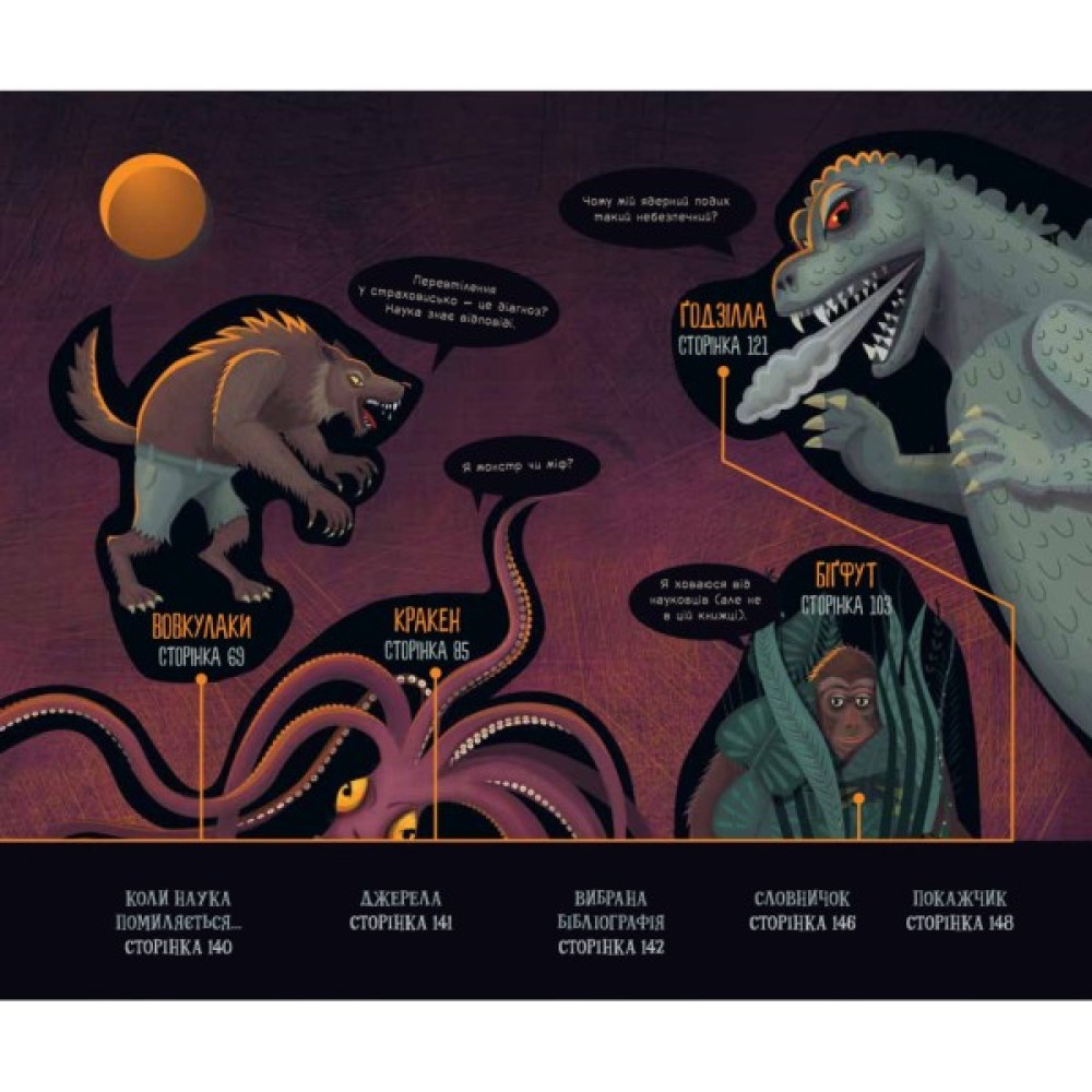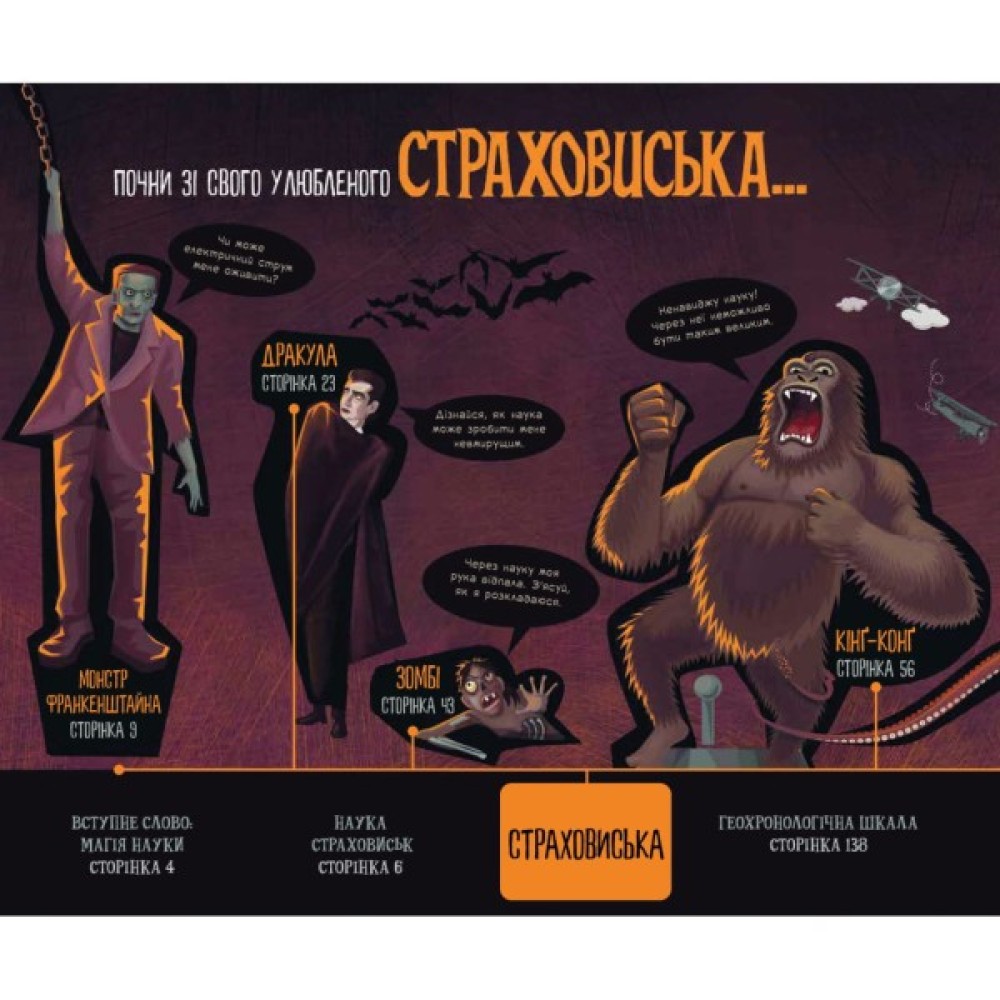 У цій книжці Карлін Бечча пропонує абсолютно новий погляд — науковий — на добре знайомих тобі страховиськ, зокрема вовкулак, вампірів та зомбі. Дізнайся походження восьми жаских монстрів, з’ясуй, які значущі історичні події надихнули на їх створення, і заглибся в наукові дослідження, що криються за цими створіннями. Розглянь часові шкали, мапи та інфографіку, які містять найважливішу інформацію, наприклад життєвий цикл вірусу зомбі або як пережити ядерний подих Ґодзілли. Сповнена крові, кишок, історії та науки, ця книжка стане чудовим подарунком для шанувальників страховиськ різного віку.