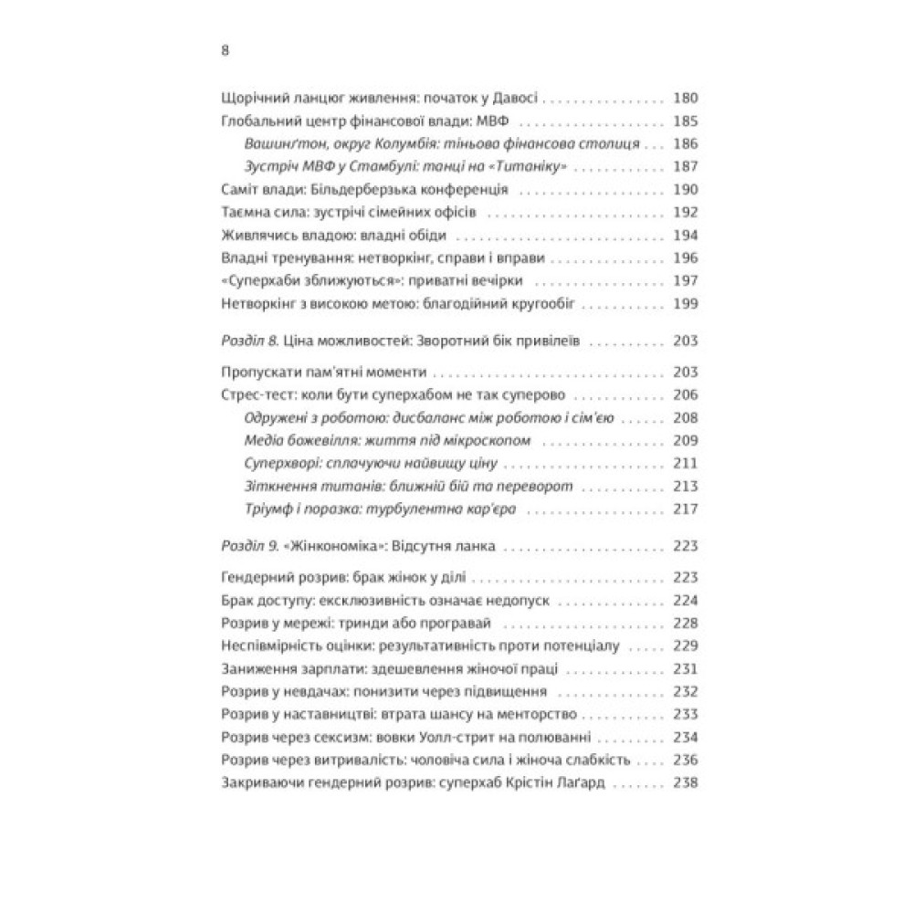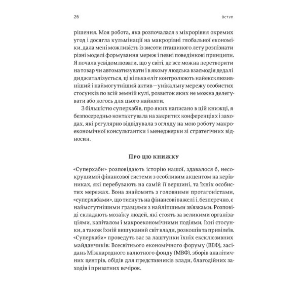 Авторка «Суперхабів» Сандра Навіді є «своєю» в колах світової фінансової еліти, проте завдяки деяким обставинам її погляд залишається відстороненим. Однорідність вузького кола людей, які ухвалюють чільні фінансові рішення світового масштабу, є однією з серйозних проблем, які вона порушує у цій книжці.