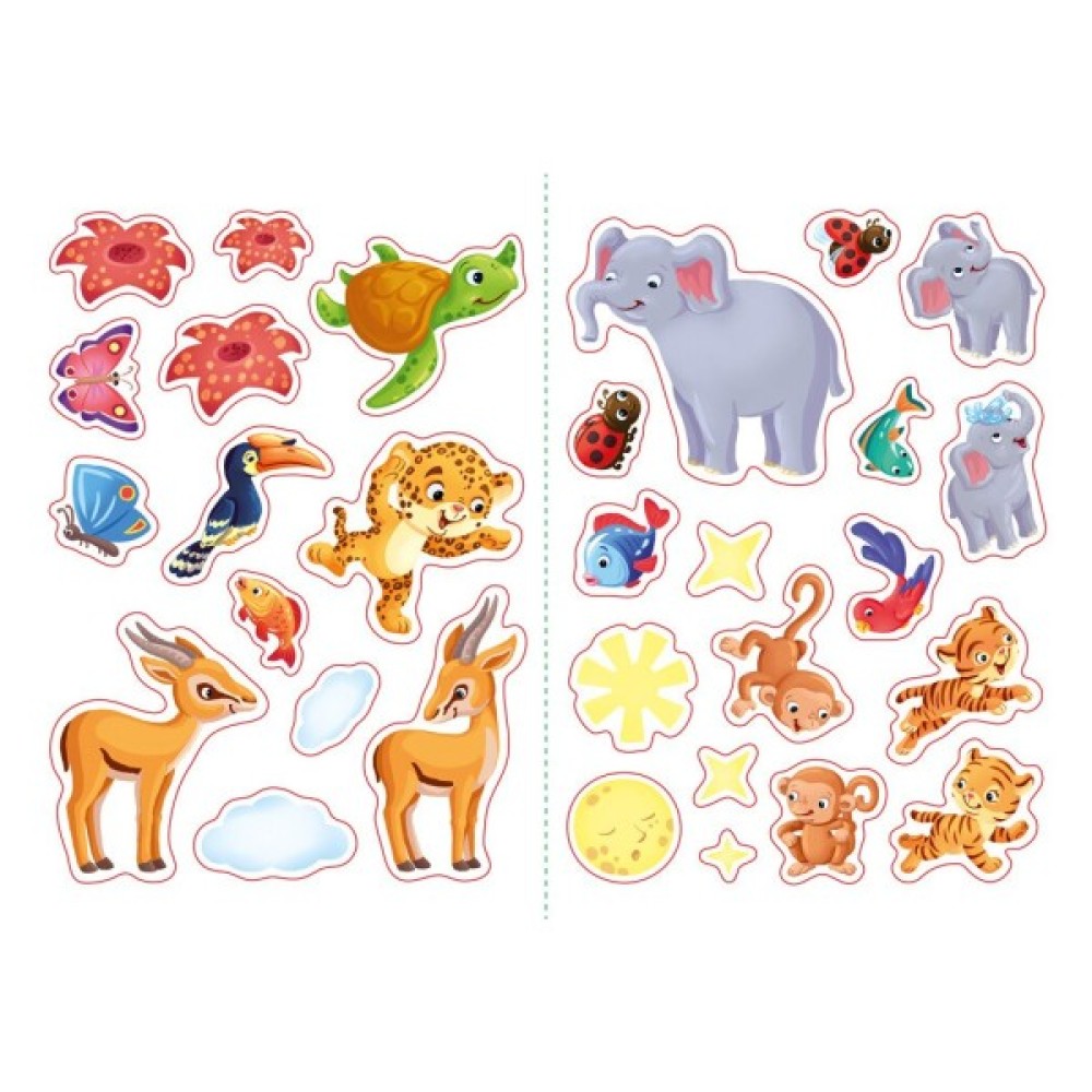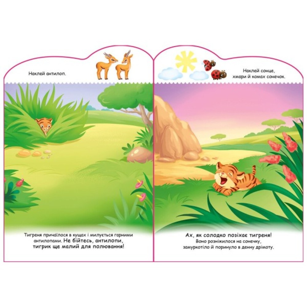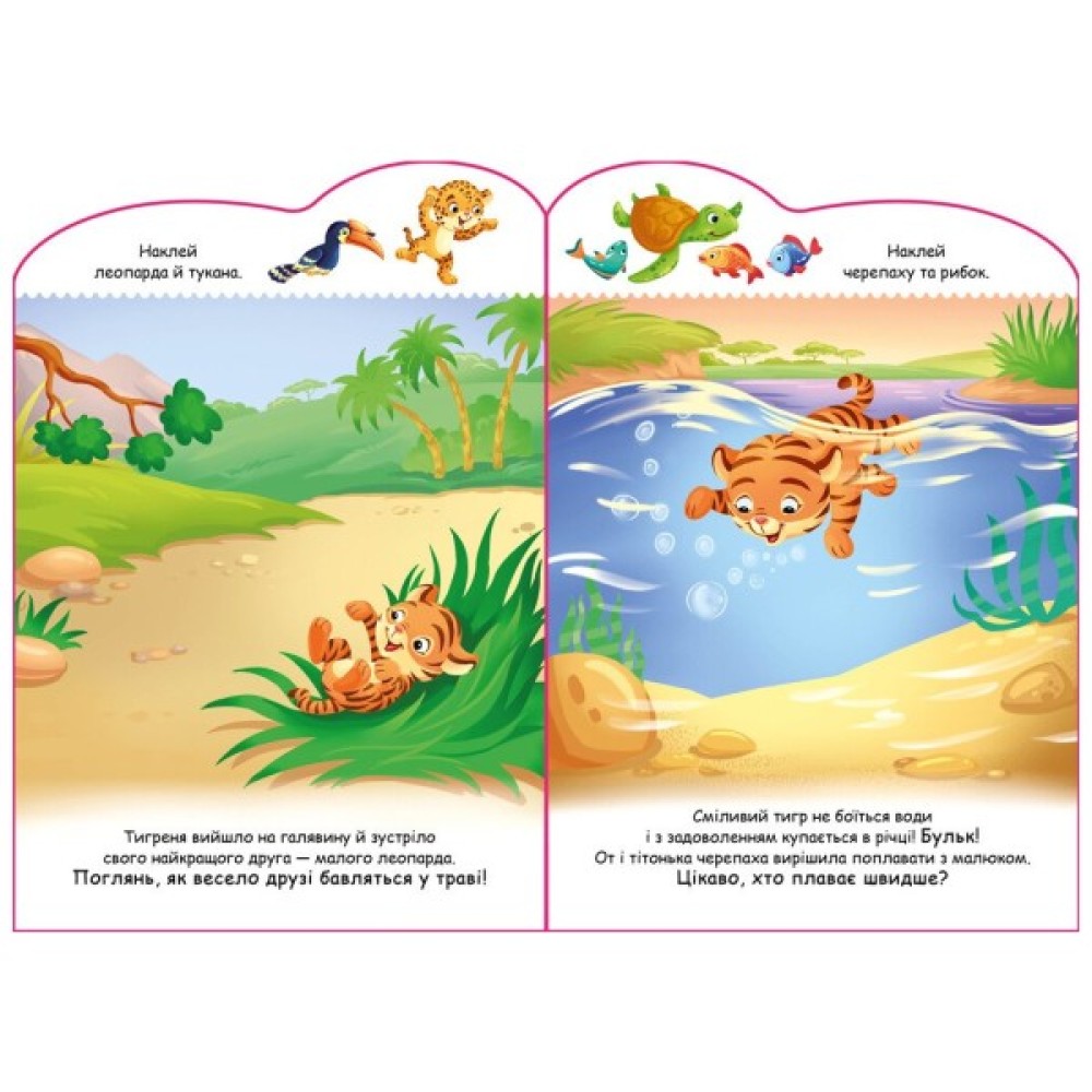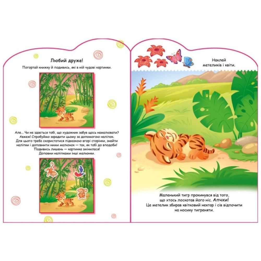 Ваша дитина любить тварин? А наліпки? У книжці вона знайде і те, й інше! Короткі прості сюжети про тигреня, великі барвисті наліпки, якими малюк доповнить картинки, — з цією книжкою час промайне цікаво й весело! Завдяки багаторазовим наліпкам дитина може щоразу створювати нову картинку і придумувати свою історію.