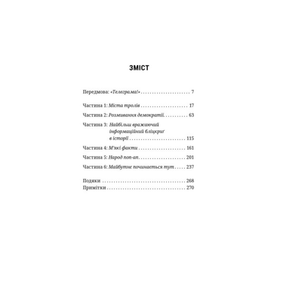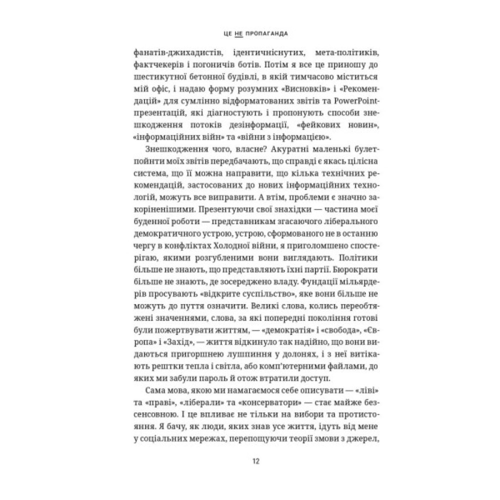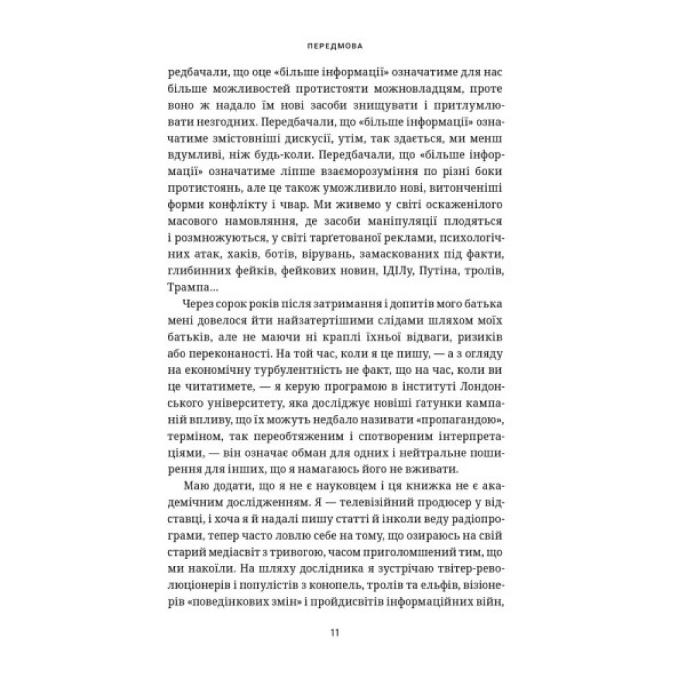Ця книжка про інформаційні війни, ботів і погоничів ботів, про тролів і хакерів, про фейкові новини і втрату прозорої політичної дискусії. А ще – про ХХ століття, про його інтелектуальний спадок, про Холодну війну і КҐБ, про втрачену ілюзію, що більше інформації означатиме більше свободи та глибші дискусії, про пошук надії. Це також сімейна історія, й історія дисидентства, яка, здавалося, закінчиться у ХХ столітті, але триває.