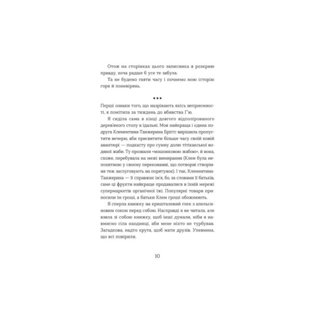 Усю школу приголомшила смерть Г’ю Генрі ван Борена, одного з найпопулярніших і найбагатших студентів. А особливо його дівчину Клем, найкращу подругу Джес. Ніби самого вбивства мало, виявляється, що Г’ю помер точно у такий самий спосіб, як і герой оповідання, яке нещодавно написала Джес. І ось уже незабаром дівчина отримує анонімне повідомлення із подякою за натхнення.