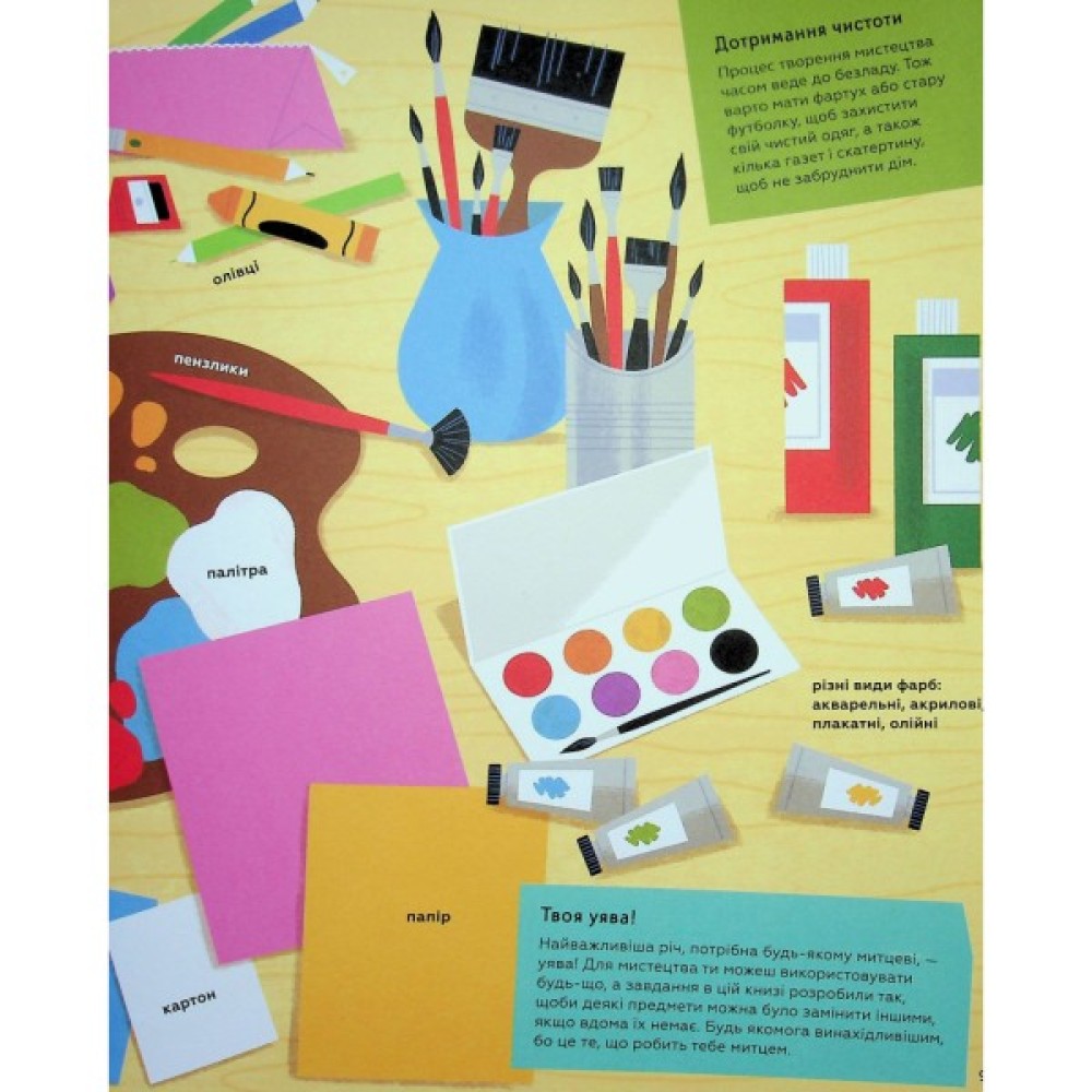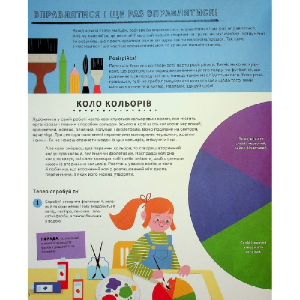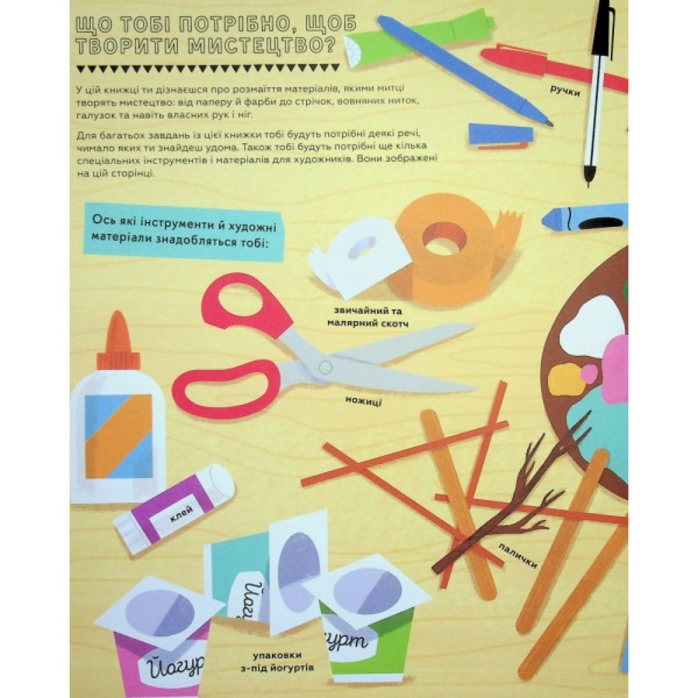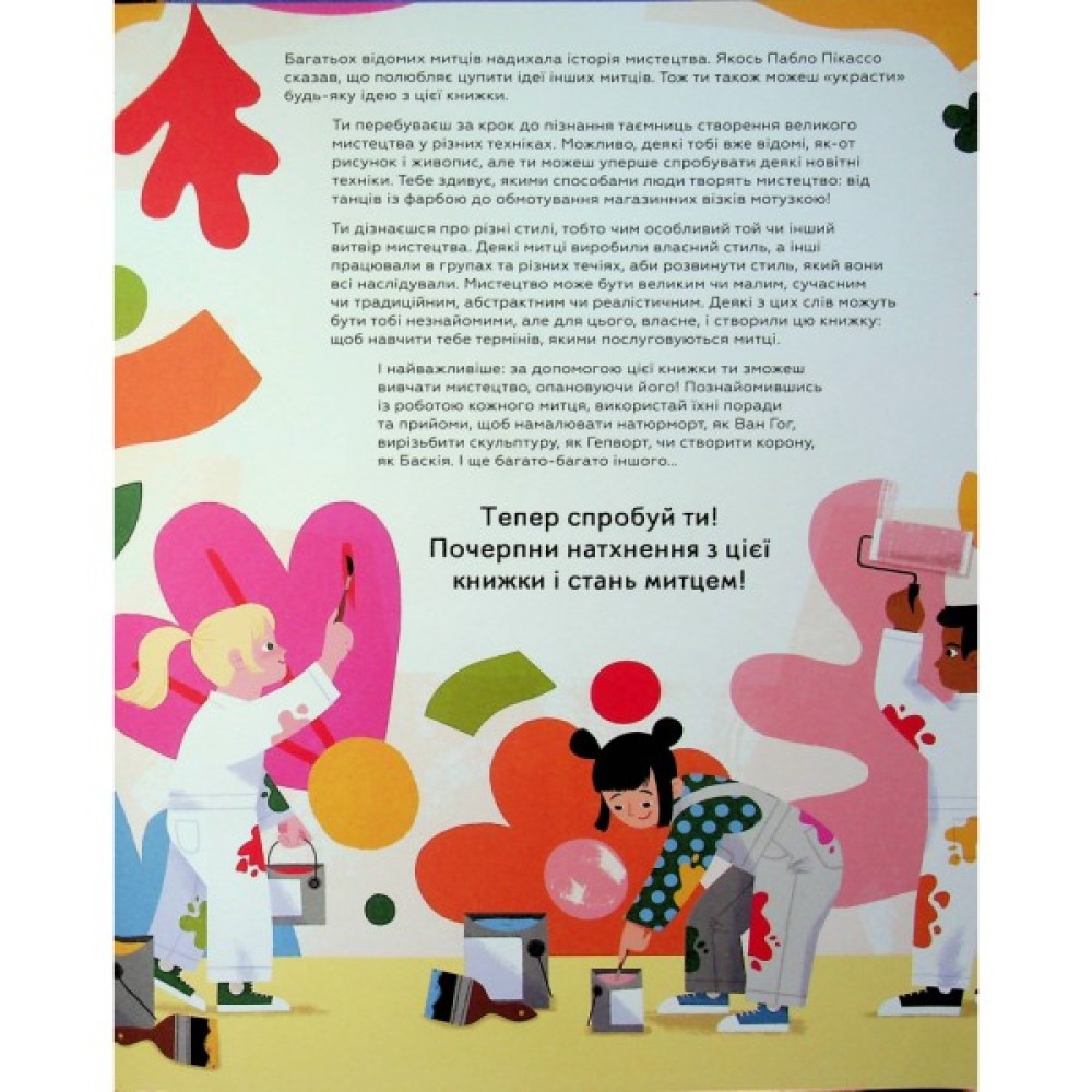 Ця книжка не лише познайомить тебе з митцями минулого й сьогодення з різних країн світу, а й дасть змогу вивчати мистецтво, опановуючи його власноруч. Ти перебуваєш за крок до того, щоб пізнати таємниці створення великого мистецтва з допомогою різних технік. Можливо, деякі з них тобі вже відомі, як-от: рисунок і живопис, але ти можеш спробувати деякі новітні техніки вперше. Познайомившись з роботою кожного митця, ти зможеш використовувати їхні поради та прийоми, щоб намалювати натюрморт, як Ван Гог, вирізьбити скульптуру, як Гепворт, чи створити корону, як Баскія та набагато більше.