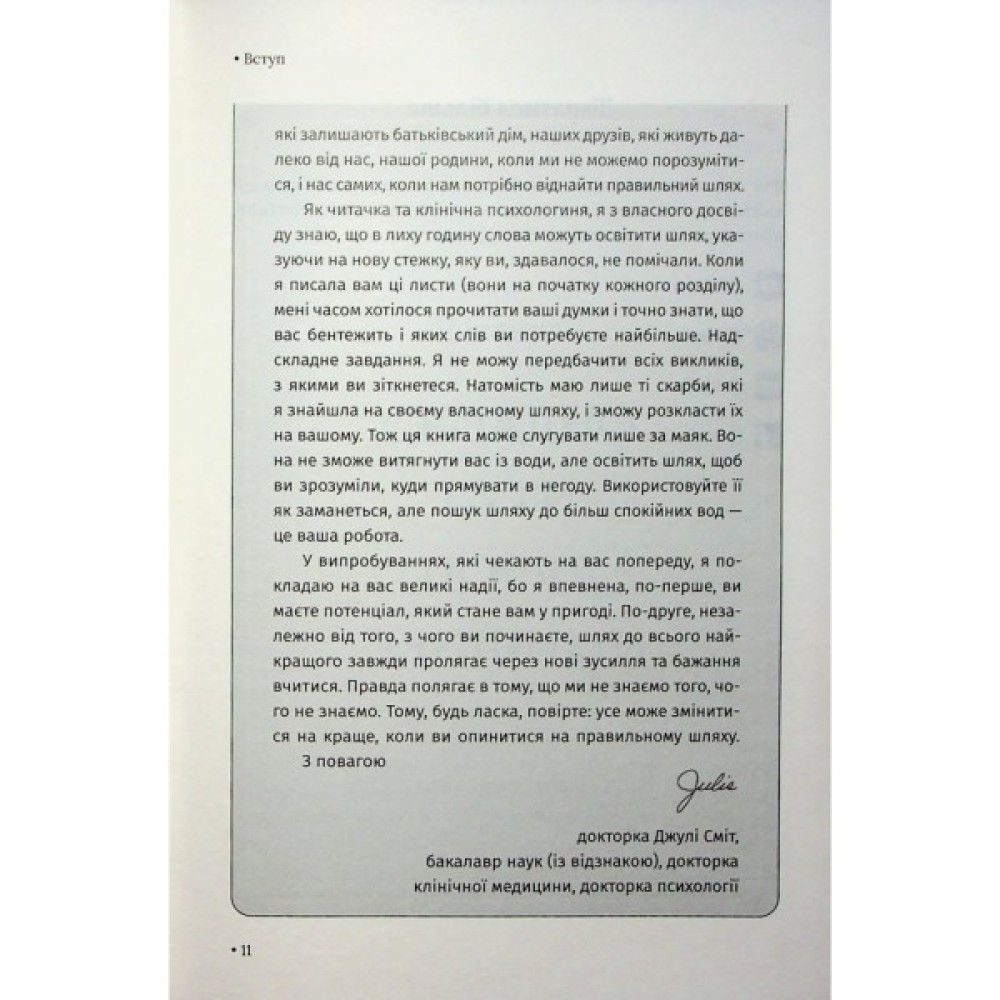 Кожен розділ - це окрема життєва ситуація, знайома майже кожному. У формі стилізованих листів докторка Сміт звертається до читача тоді, коли здається, що все виходить з-під контролю через тривогу, розгубленість і сумніви, а опісля надає практичні поради й техніки, які допоможуть побачити ситуацію під новим кутом, знайти опору й зробити перший крок до спокою.