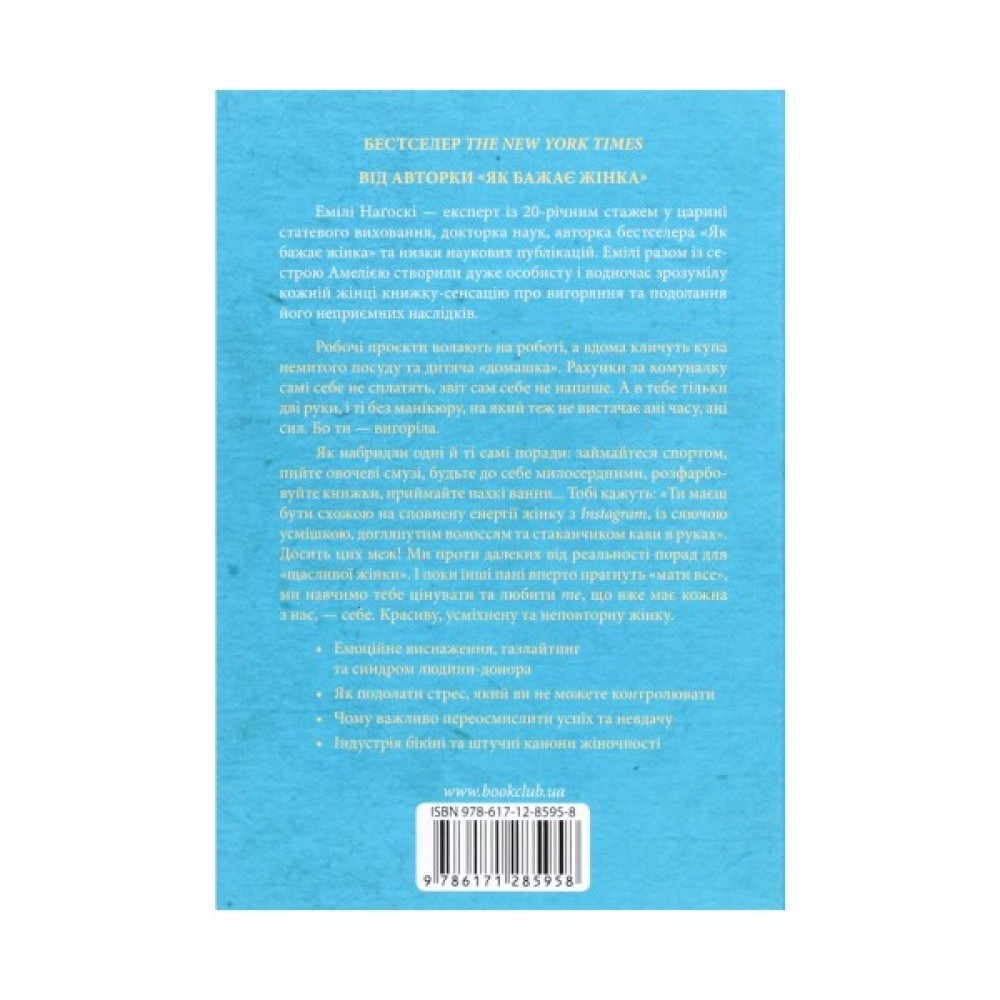 Емілі Наґоскі — експерт у сфері статевого виховання з двадцятирічним стажем, має ступінь доктора філософії, авторка бестселера «Як бажає жінка» та низки наукових публікацій. Разом із сестрою Амелією створили дуже особисту і водночас зрозумілу кожній жінці книжку-сенсацію про жіноче вигоряння та подолання його неприємних наслідків.
