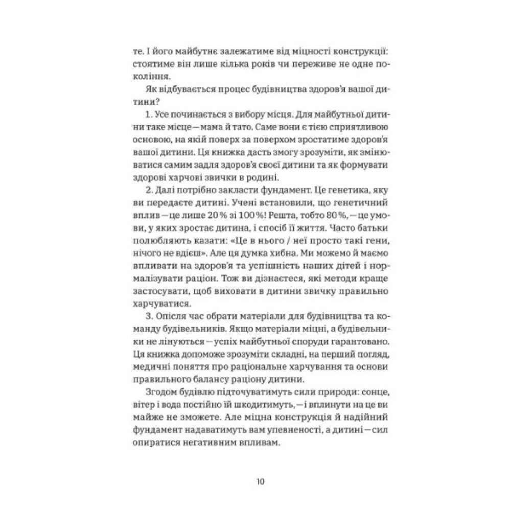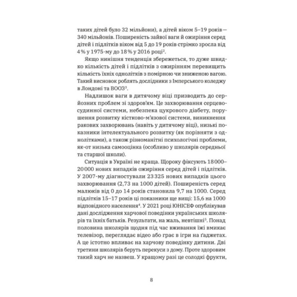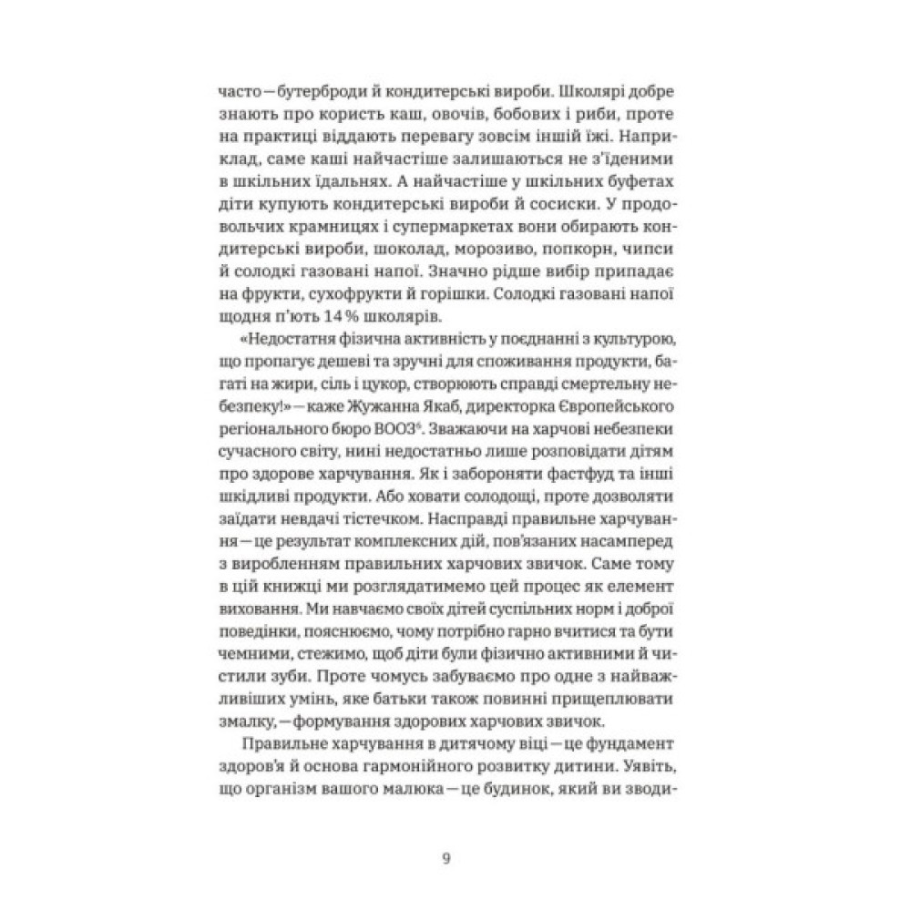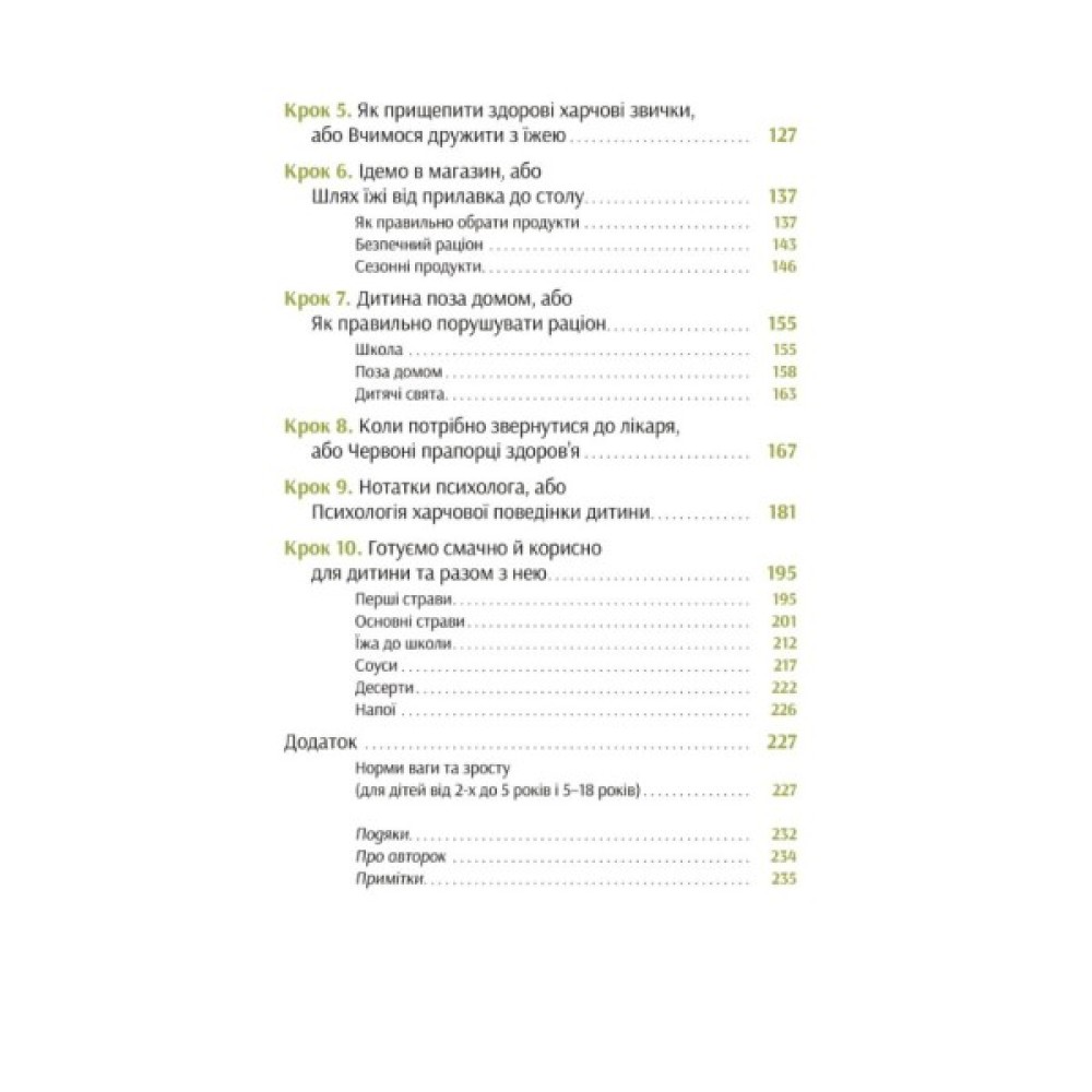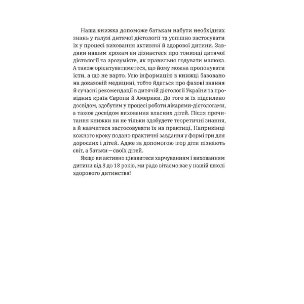 У своїй книжці Наталія Самойленко та Анна Бєлокоз, експертки у сфері дієтології та ендокринології з багаторічним стажем, розкажуть усю найважливішу інформацію про дитяче харчування, основи фізіології харчування у дитячому віці, причини набору чи дефіциту ваги і проблем зі здоров'ям дитини. Ви навчитеся складати раціон та питний режим з урахуванням віку та рівня фізичної активності вашої дитини. Також зможете правильно застосувати знання на практиці: організовувати дитячі свята, планувати графік харчування та знаходити альтернативу нездоровим продуктам. Вам стануть у пригоді безліч підказок, рецептів, корисних таблиць, списків закупок і навіть ігри, які ви зможете запропонувати своїм дітям. Плекаймо здорове майбутнє!
