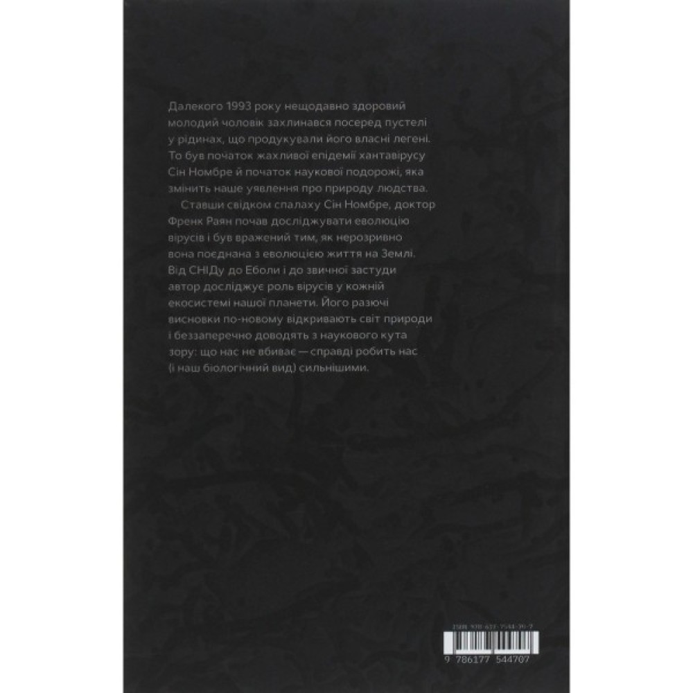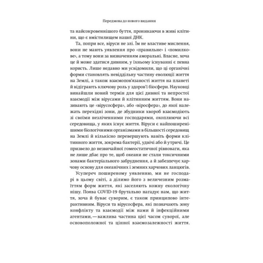 Це науково-популярне видання лікаря-дослідника про найпоширеніші віруси і їхню роль у нашому житті. Автор доступною мовою пояснює, як діють віруси, звідки вони з’являються і чому без них не обійтись, чим вони нам загрожують та як ми можемо пом’якшити їхню загрозу.