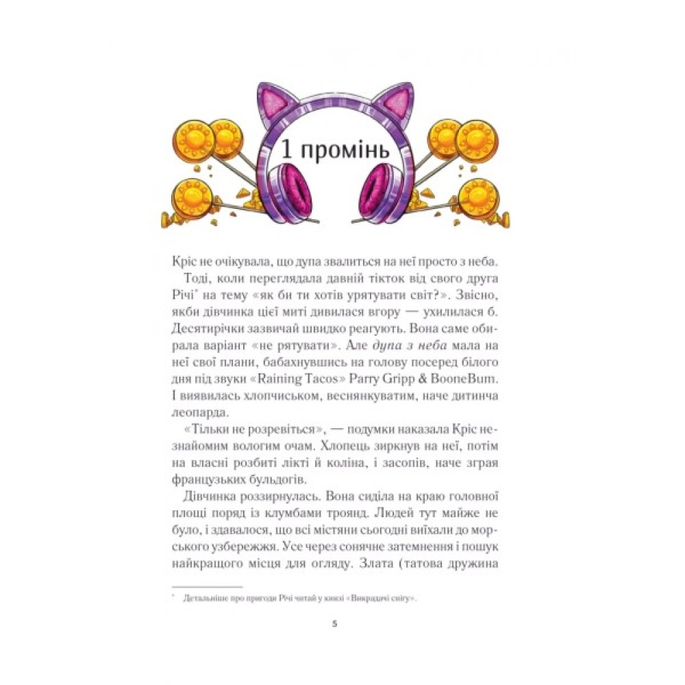 Після зустрічі з хлопчиком Кріс написала Річі, своєму другу за книжковим листуванням (і головному герою роману «Викрадачі снігу», але це секрет). Раніше дівчинка казала йому, що хоче братика, та миттєво змінила думку, бо гратися із плаксієм їй аж зовсім не хочеться. Утім, Кріс знову побачить незнайомця. Ба більше, героїня допоможе йому із порятунком світу! Хлопчик, що впав із неба, є мешканцем Сонця, і воно от-от згасне, якщо додому не повернути дракончика, який нещодавно вилупився з яйця.