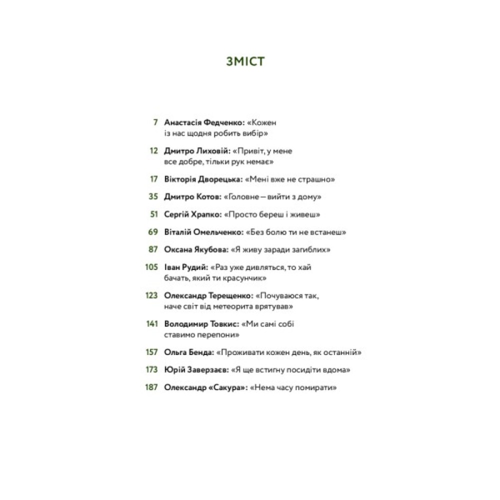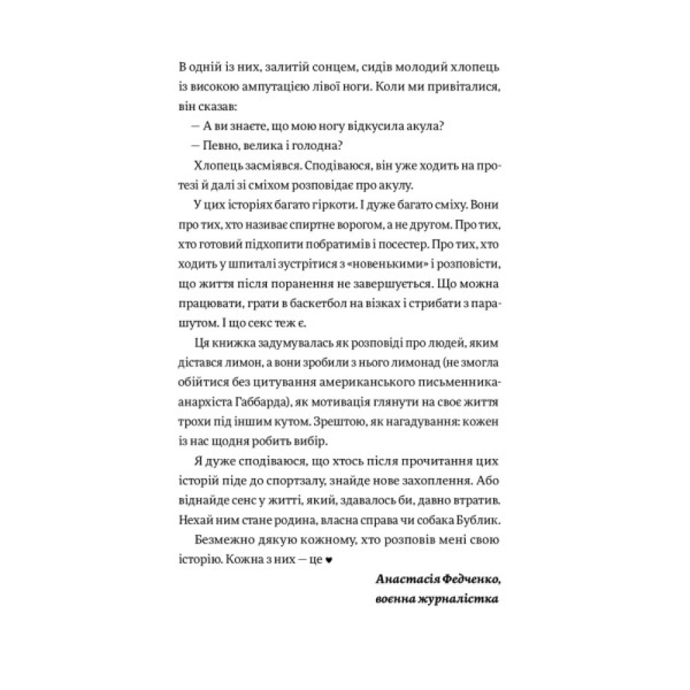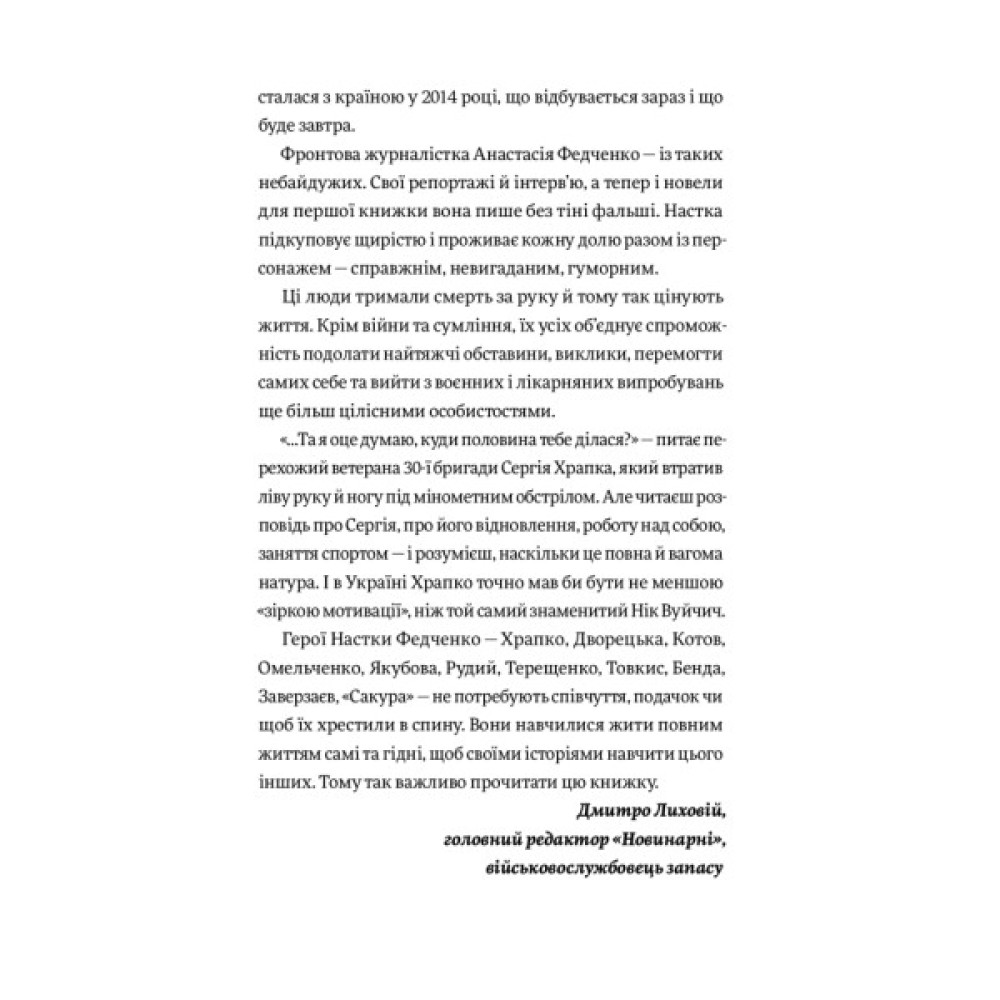 У книжці Анастасії Федченко ви прочитаєте 11 історій переможців і переможниць. Вони на протезах підкорюють Говерлу й біжать марафони, стрибають з парашутом та здобувають медалі на спортивних змаганнях, працюють, подорожують і народжують дітей. У кожного свій шлях і свій темп: хтось досі не може спокійно згадувати момент поранення, а хтось жорстко жартує про втрачені кінцівки. Ці історії змушують плакати, сміятися, холонути від жаху й дивуватися світлу, якому є місце навіть на війні. Вони — надихають.