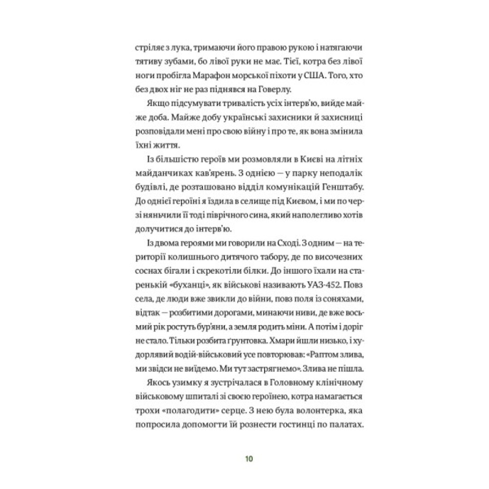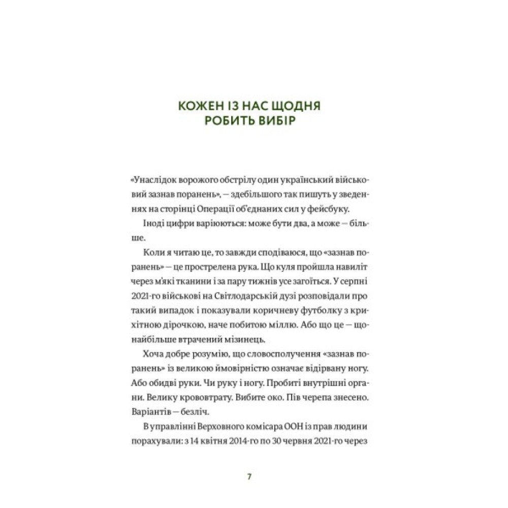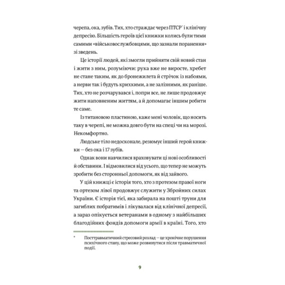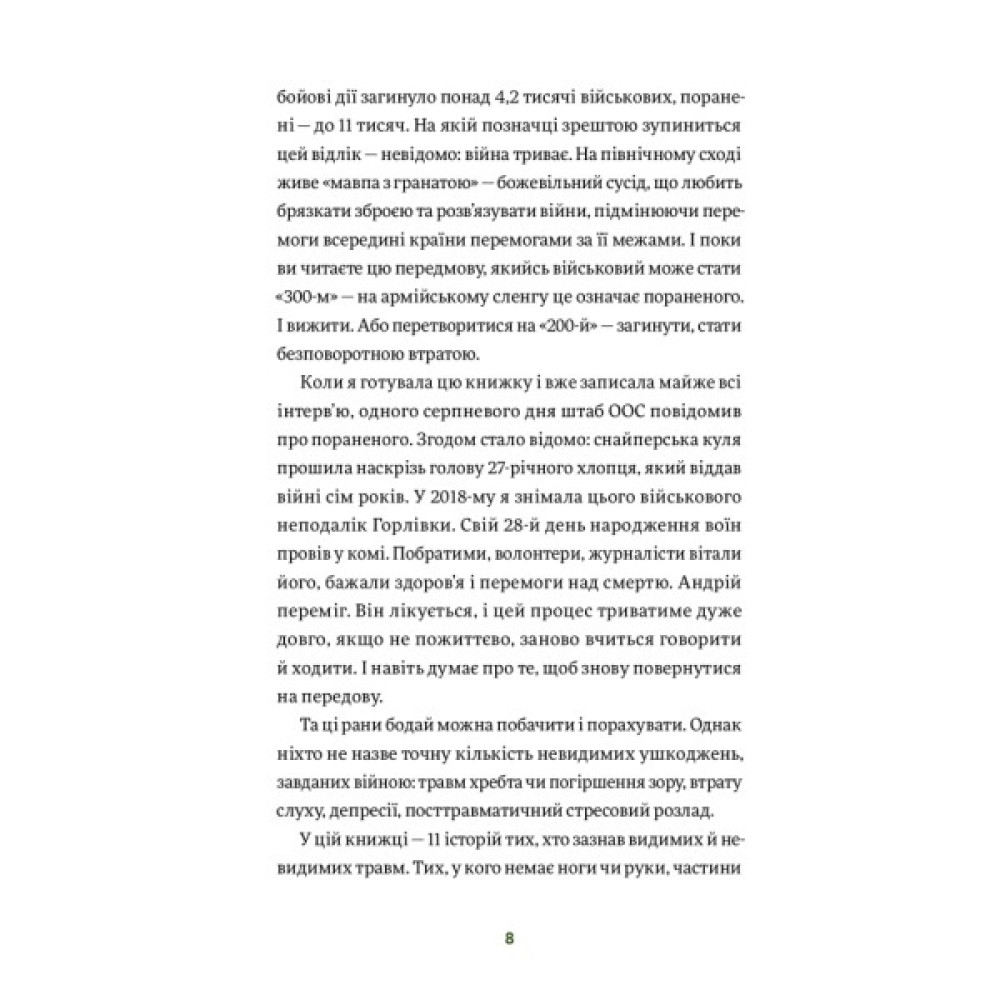 Ця книжка не лише для людей, що бачили війну зблизька, вона — для кожного з нас (і про кожного з нас). Адже будь-які наші рани і втрати — видимі чи невидимі — можуть стати якорем, а можуть — трампліном до чогось абсолютно нового.