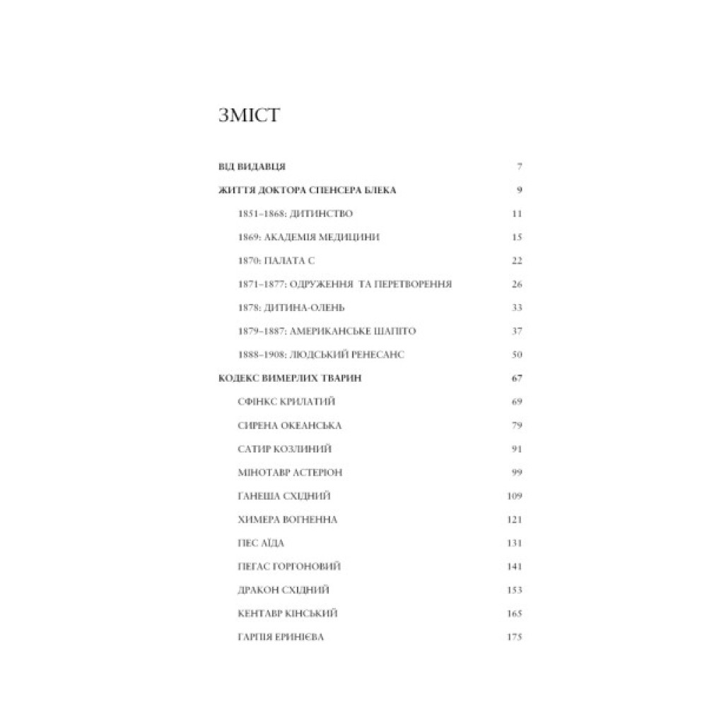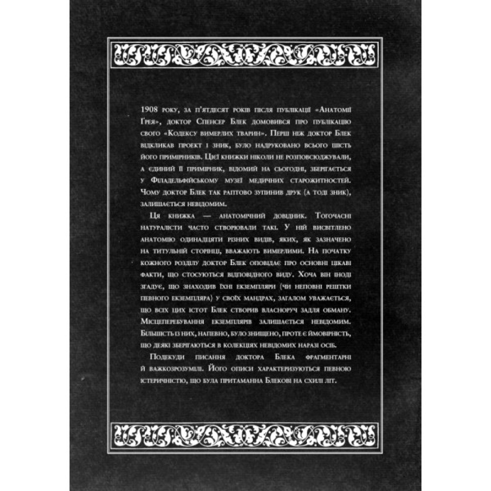 Однією із найсуперечливіших його гіпотез є: а що, як стародавні міфи правдиві? Що як істоти, які наразі існують лише у світових легендах, жили насправді й були нашими предками? Що як пам’ять про їхню будову досі проявляється в тілах окремих людей? Неприйняття з боку наукової спільноти не спиняє Блека, і він вирішує повідомити свої ідеї широкому загалу через мистецтво. Видовищні шоу, майстерно виготовлені опудала, дивовижні операції просто на сцені — усе, щоб показати, якою могла бути стародавня фауна... А наостанок — загадковий «Кодекс вимерлих тварин». За своє життя Спенсер Блек устиг написати чимало праць про свої дослідження, які не залишали наукову спільноту байдужою. Проте його вершинним твором можна назвати саме «Кодекс» — роботу, яка тривалий час залишалася недоступною читачеві. Тепер же з нею можна ознайомитися на сторінках цього видання — оцінити детальні замальовки тварин, прочитати, як доктор Блек полював на рештки легендарних істот по всьому світу. Чи справді автор «Кодексу» побачив і пережив усе, що описав на його сторінках? Вирішувати вам.