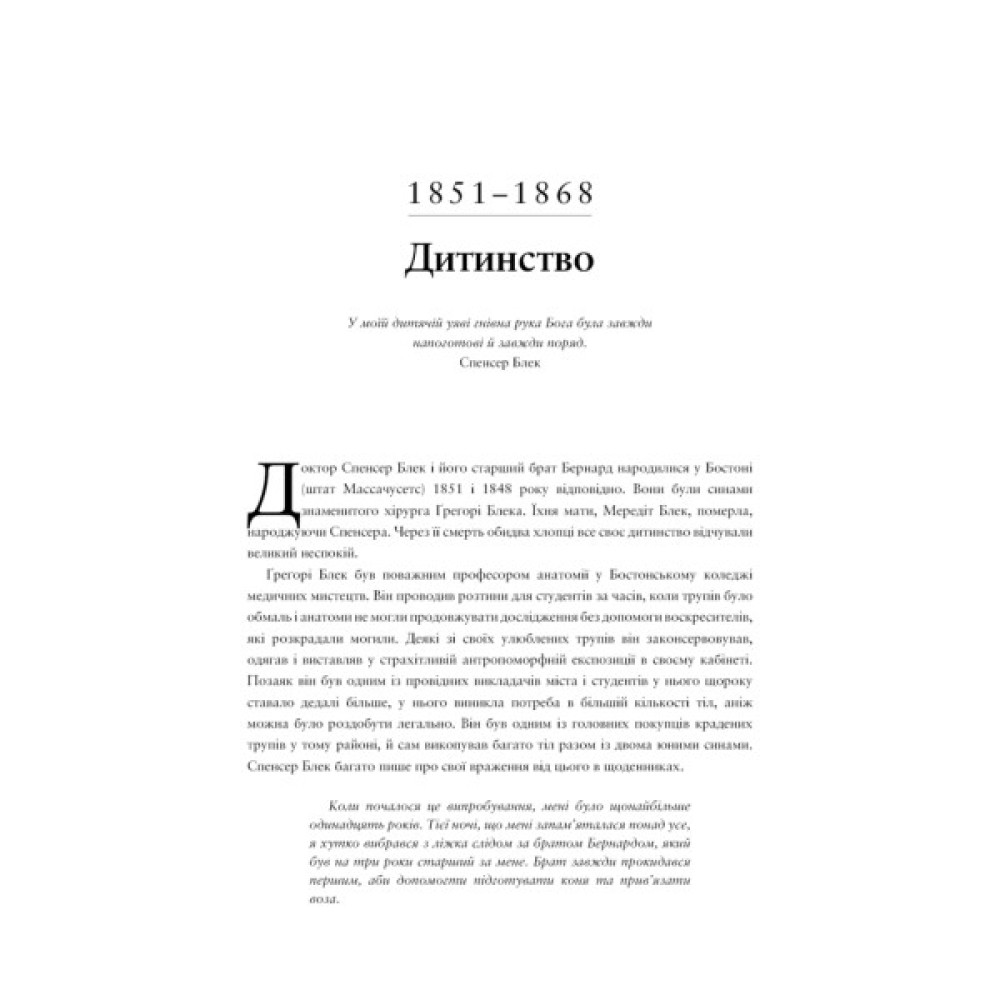 Друга половина XIX століття. Часи зародження сучасної медицини. На заваді дослідженням стають гласні й негласні перепони, породжені забобонами, як-от законодавчі обмеження щодо роботи з людськими трупами. Проте лікарі все ж таки удосконалюють хірургію та анестезію, гігієну в медицині та знання про причини хвороб. У цих умовах і зростає юний геній медицини Спенсер Блек. Він рано втратив батьків, однак здобув освіту в Академії медицини, а згодом своїми успіхами підняв її престиж до неймовірних висот. Блек зосереджується на незвичайній темі — вроджених патологіях людського організму. Розділити зрослі пальці? Видалити зайву руку? Для Спенсера Блека немає нічого неможливого! Згодом наполеглива праця приносить йому визнання і гроші. У цей період він зустрічає однодумницю й кохану людину. Однак щасливе сімейне життя лікаря триває недовго. А все через його хворобливу одержимість роботою.