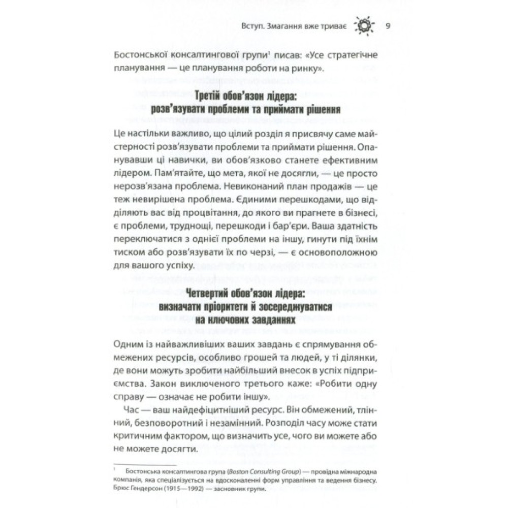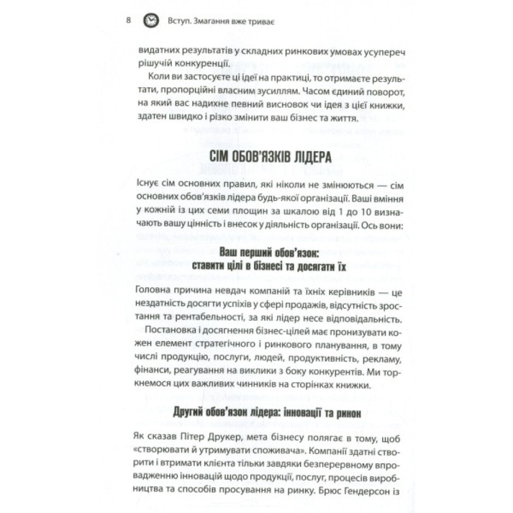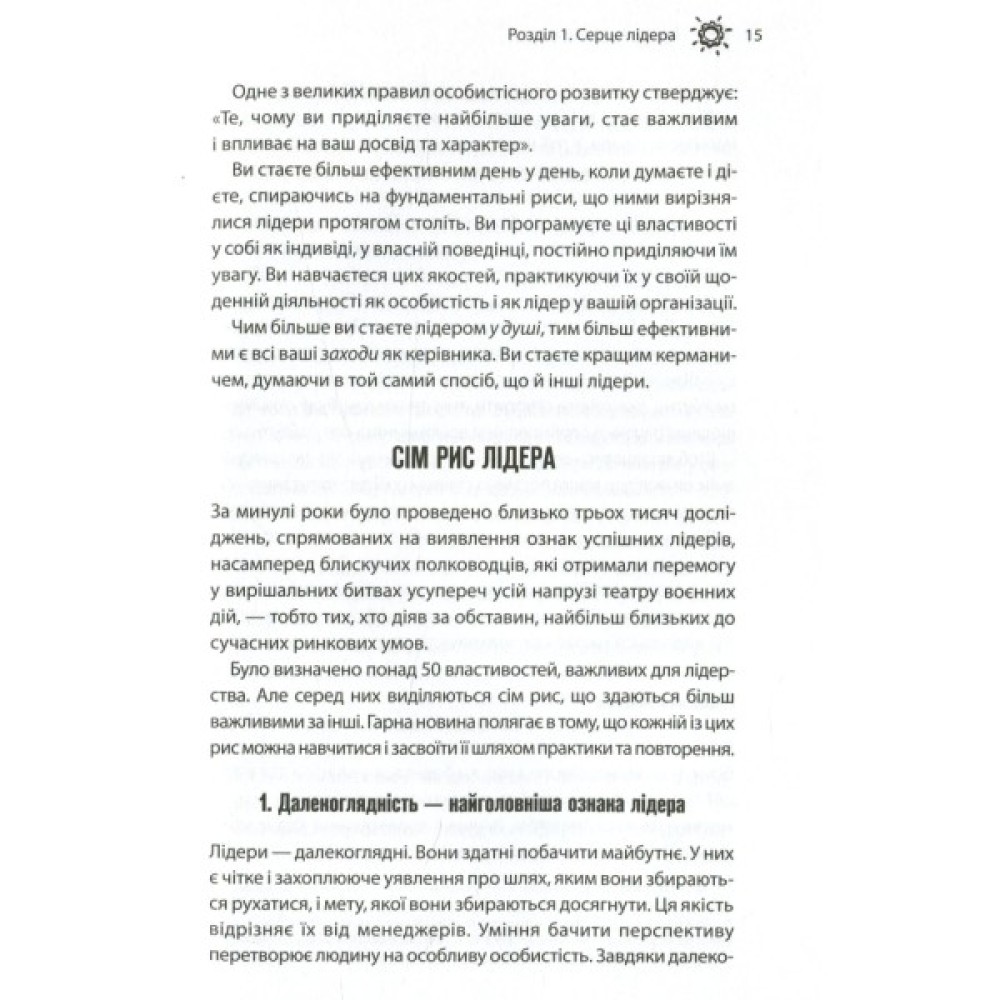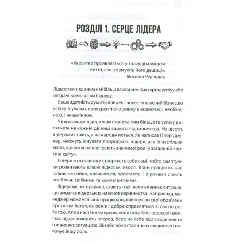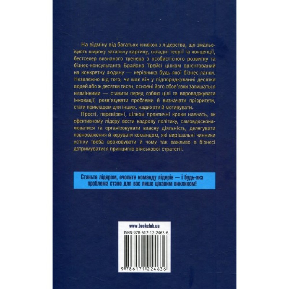 На відміну від багатьох книжок з лідерства, що змальовують широку загальну картину, складні теорії та концепції, бестселер визнаного тренера з особистісного розвитку та бізнес-консультанта Брайана Трейсі цілком орієнтований на конкретну людину — керівника будь-якої бізнес-ланки. Незалежно від того, чи має він у підпорядкуванні десятки людей або ж десятки тисяч, основні його обов’язки залишаться незмінними — ставити перед собою цілі та впроваджувати інновації, розв’язувати проблеми й визначати пріоритети, стати прикладом для інших, надихати й мотивувати.
