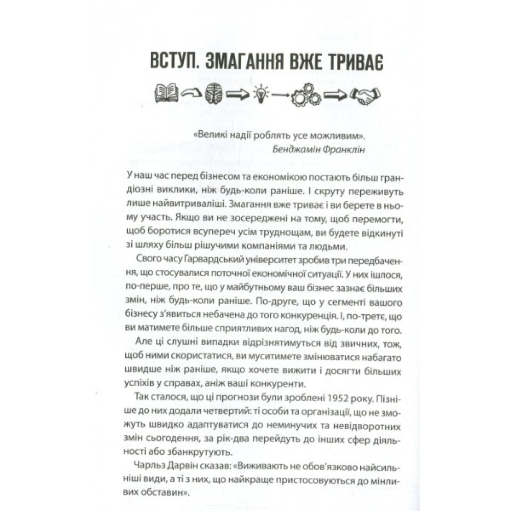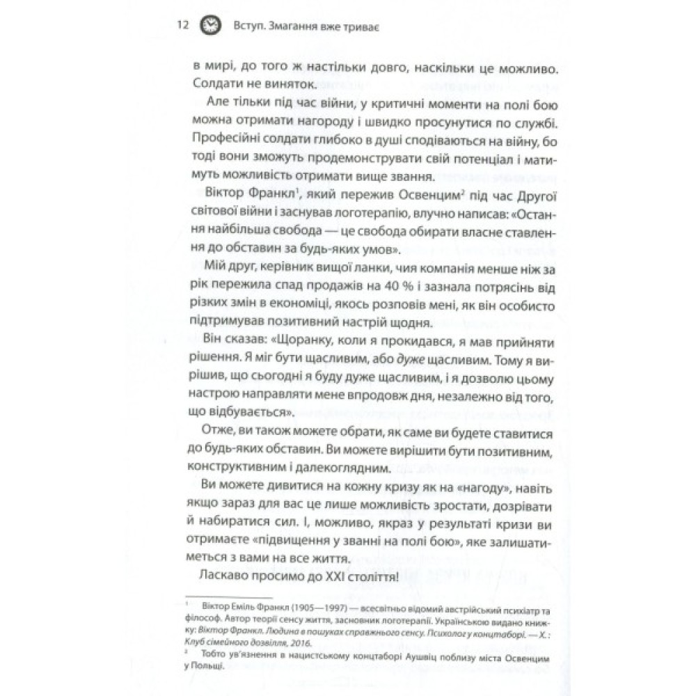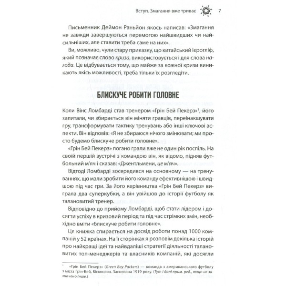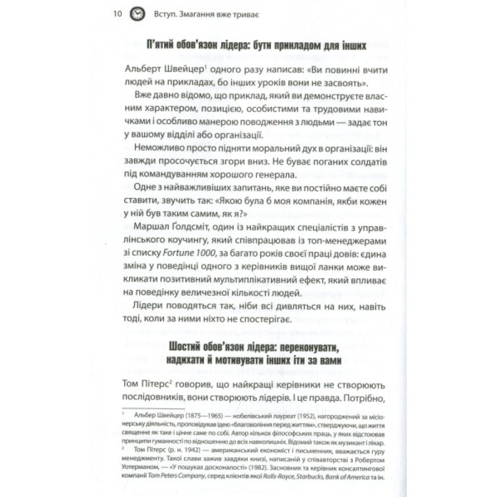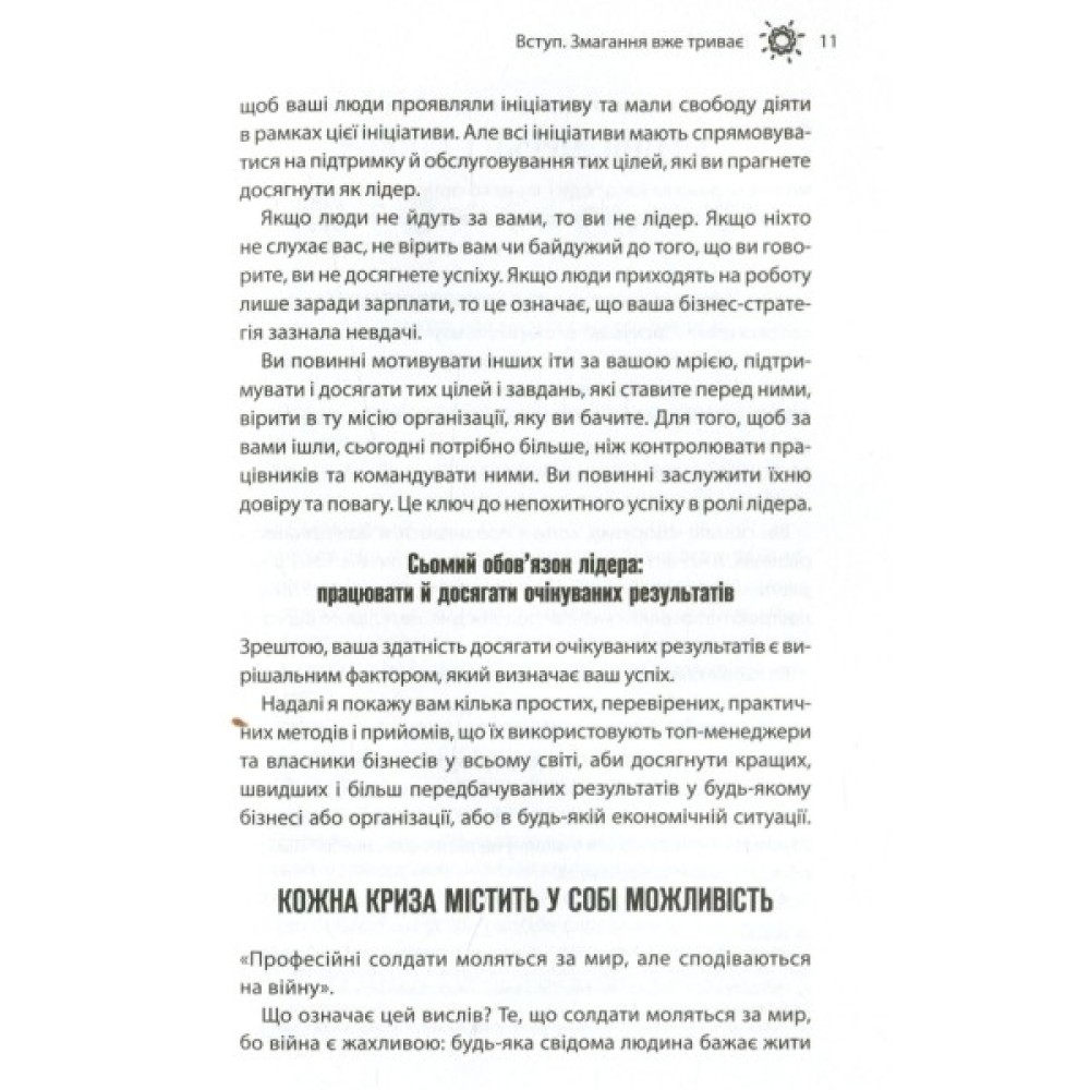 На відміну від багатьох книжок з лідерства, що змальовують широку загальну картину, складні теорії та концепції, бестселер визнаного тренера з особистісного розвитку та бізнес-консультанта Брайана Трейсі цілком орієнтований на конкретну людину — керівника будь-якої бізнес-ланки. Незалежно від того, чи має він у підпорядкуванні десятки людей або ж десятки тисяч, основні його обов’язки залишаться незмінними — ставити перед собою цілі та впроваджувати інновації, розв’язувати проблеми й визначати пріоритети, стати прикладом для інших, надихати й мотивувати.