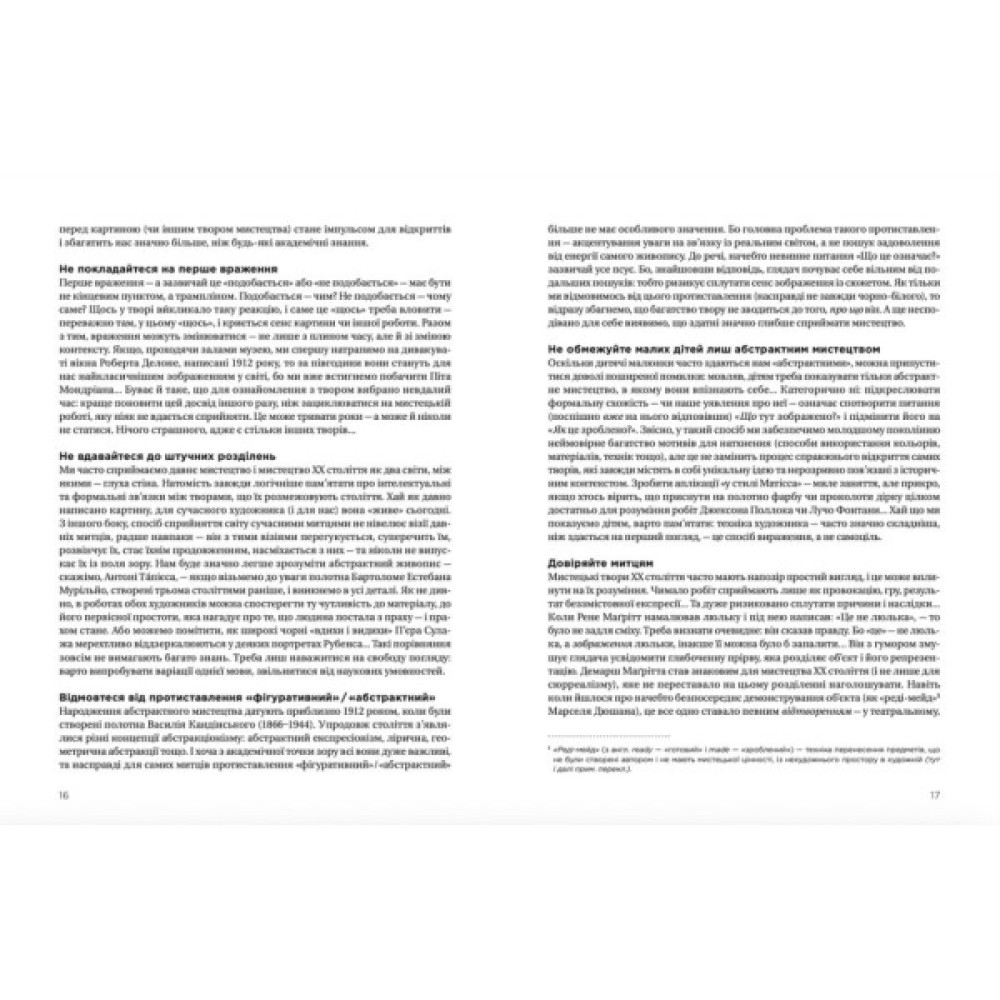Щоб продовжити захопливу бесіду, розпочату в бестселері «Як розмовляти з дітьми про мистецтво», авторка пропонує ознайомитися з творчістю сучасних художників і по-справжньому зрозуміти й полюбити мистецтво, яке може здаватися найскладнішим для розуміння. Для цього вона радить забути про всі упередження та ярлики, відкинути непевність — і показує, як довіритися художникам, як перейнятися кожним, навіть найхимернішим, твором; вчить дивитися, бачити і... просто насолоджуватися.