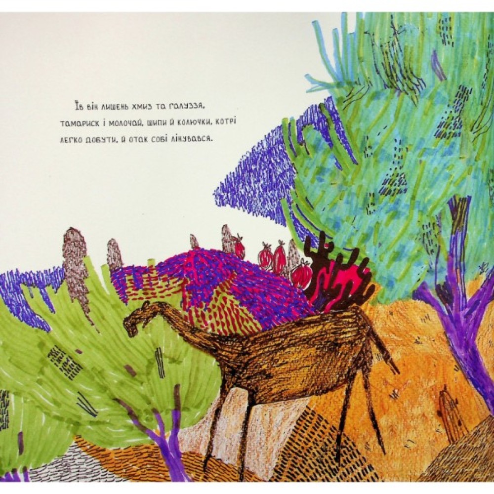 Сюжет відомої казки Редьярда Кіплінга про лінькуватого Верблюда в цій книжці набуває нових вигадливих форм завдяки ілюстраціям екохудожниці Тетяни Белащук — простим і щирим, як дитячі малюнки, і водночас загадковим та символічним, як наскельний живопис.