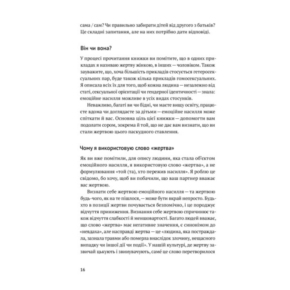 Безцінний ресурс для чоловіків і жінок, які зазнають емоційного насилля, а також для психотерапевтів і адвокатів. Підтримка, пожива й дороговказ для всіх, хто хоче розірвати пута сорому та здобути емоційну свободу для створення здоровіших і тривалих стосунків.