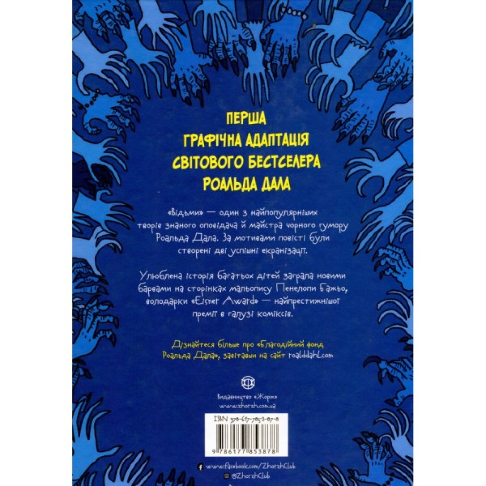 "Перша графічна адаптація світового бестселера Роальда Дала. «Відьми» — один з найпопулярніших творів знаного оповідача й майстра чорного гумору. За мотивами роману були створені дві успішні екранізації. Улюблена історія багатьох дітей заграла новими барвами на сторінках мальопису Пенелопи Бажьо, володарки «Eisner Awards» — найпрестижнішої премії в галузі коміксів.