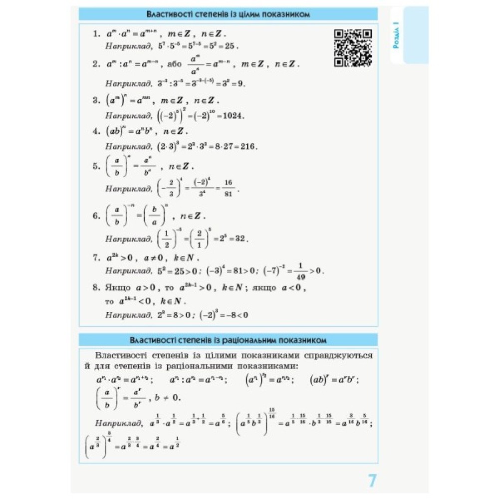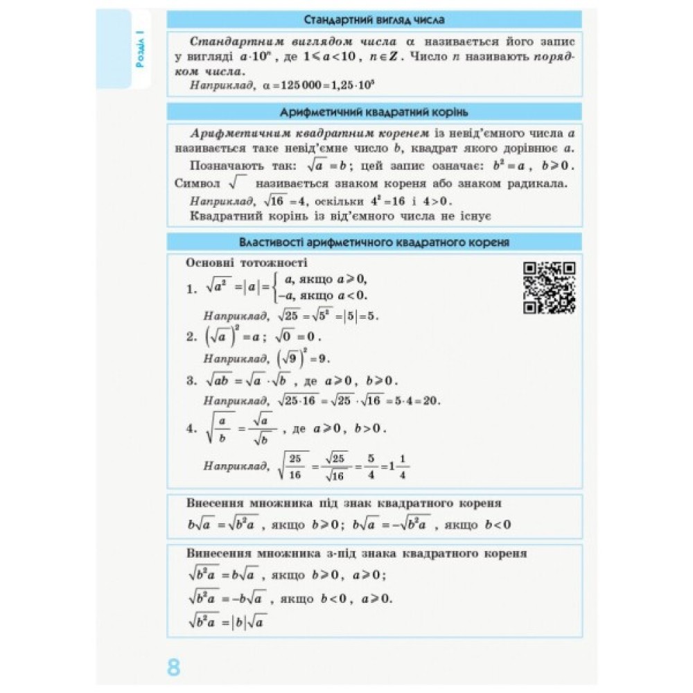 Посібник має електронний додаток, розміщений на сайті interactive.ranok.com.ua. Скориставшись QR-кодами, розташованими на сторінках посібника, можна завантажити схеми розв’язання рівнянь і нерівностей, добірки основних формул за темами та ознайомитись з відео, що ілюструє навчальний матеріал (пов’язані з відео QR-коди наведені в блакитних рамках).