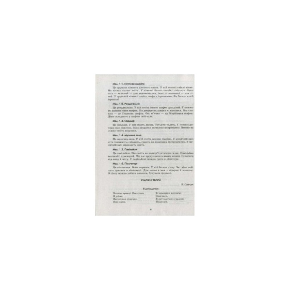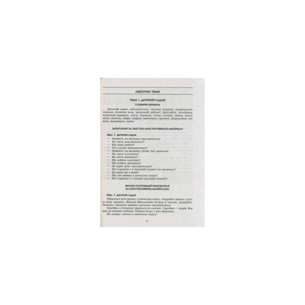 До кожної лексичної теми в посібнику подано предметні та сюжетні картинки, дібрано художні твори та дидактичні ігри, розкрито систему роботи над наочним матеріалом, спрямовану на збагачення й активізацію словникового запасу дітей, формування навичок зв’язного мовлення.