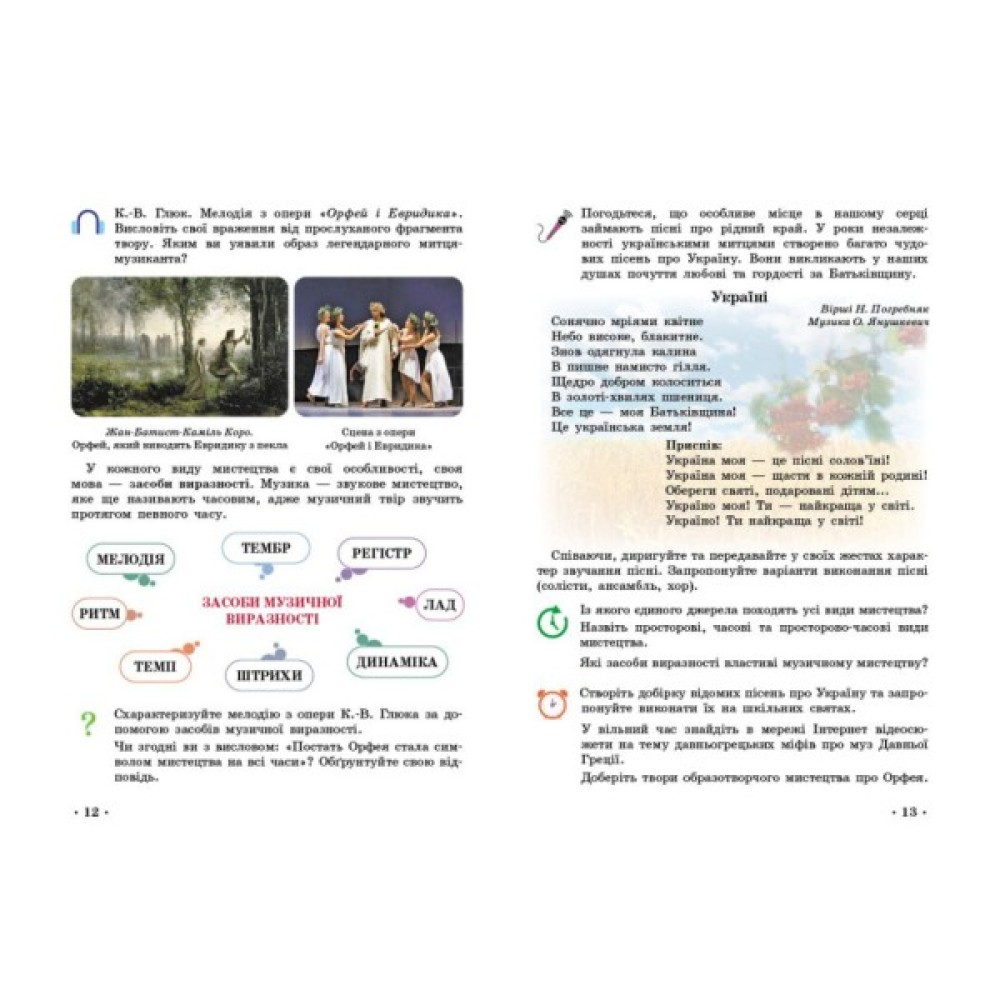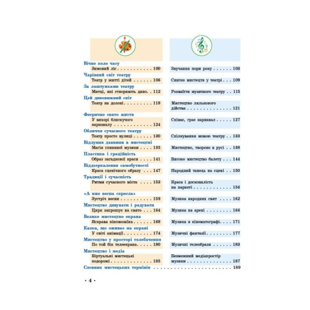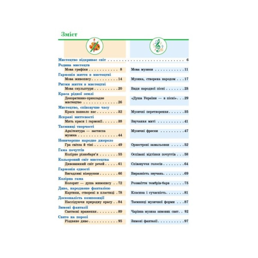 Зміст видання повністю охоплює визначені програмою освітні години: 35 тем по 2 години в кожній — для образотворчої та музичної складової, загалом 70 годин.
