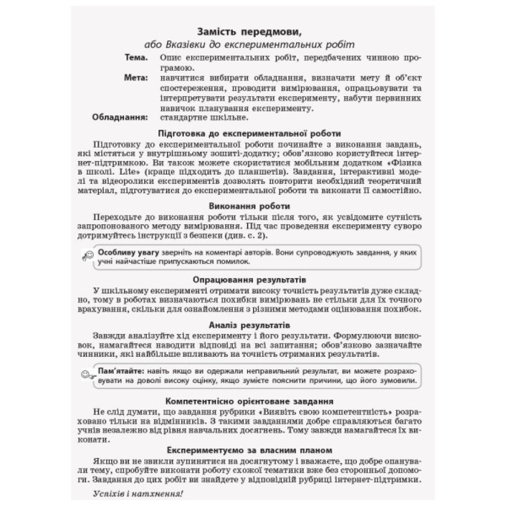 Матеріали зошита й інтернет-підтримки (відеоролики експериментальних робіт, інтерактивні моделі, завдання для проведення експериментів за власним планом) допоможуть реалізувати особистісно орієнтований підхід до навчання та організувати діяльність учнів із підготовки до свідомого виконання експериментальних робіт.