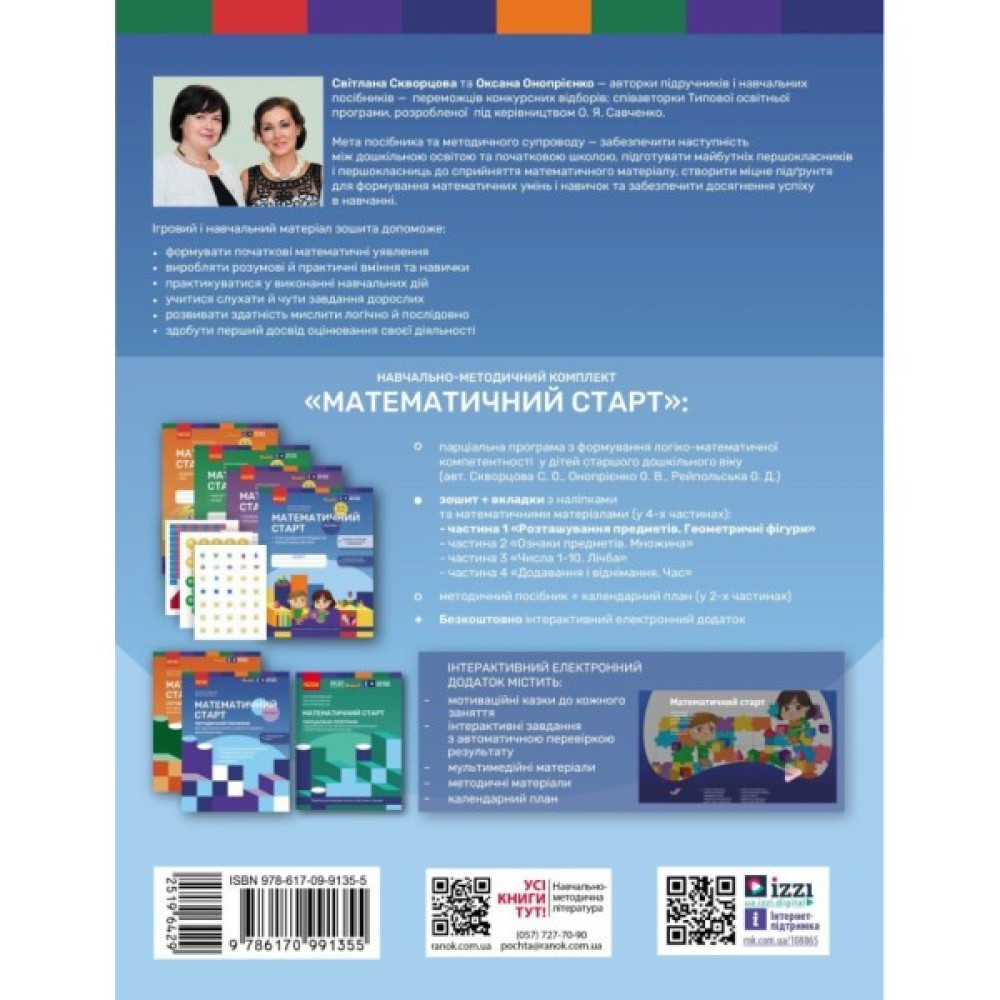 Посібник створено відповідно до парціальної програми з формування логіко-математичної компетентності у дітей старшого дошкільного віку «Математичний старт» (авт. Скворцова С. О., Онопрієнко О. В., Рейпольська О. Д.).