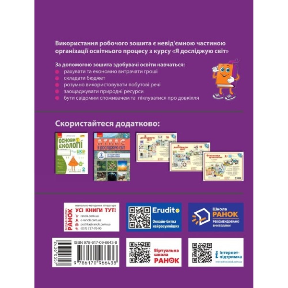 Використання робочого зошита "Фінансова грамотність" 4 кл. є невід'ємною частиною організації освітнього процесу з курсу "Я досліджую світ", а також стане у пригоді при вивченні варіативного курсу «Цікава економіка» За допомогою зошита здобуваці освіти навчаться рахувати та економно витрачати гроші, складати бюджет, розумно використовувати побутові речі, заощаджувати природні ресурси, бути свідомими споживачами та піклуватися про довкілля. Призначено для учнів 4 класу закладів загальної середньої освіти, учителів початкових класів.