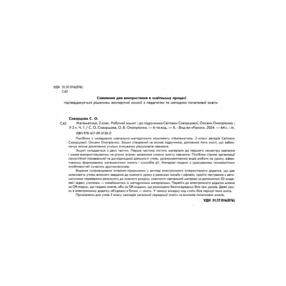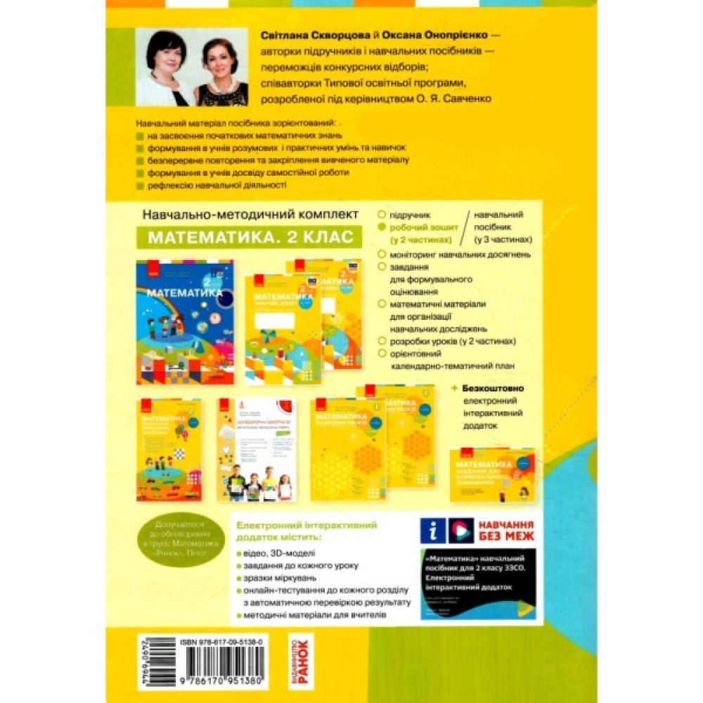 Посібник є складовою навчально-методичного комплекту «Математика. 2 клас» авторів Світлани Скворцової, Оксани Онопрієнко. Зошит створений на основі підручника, доповнює його зміст, що забезпечує якісне досягнення учнями очікуваних результатів навчання.