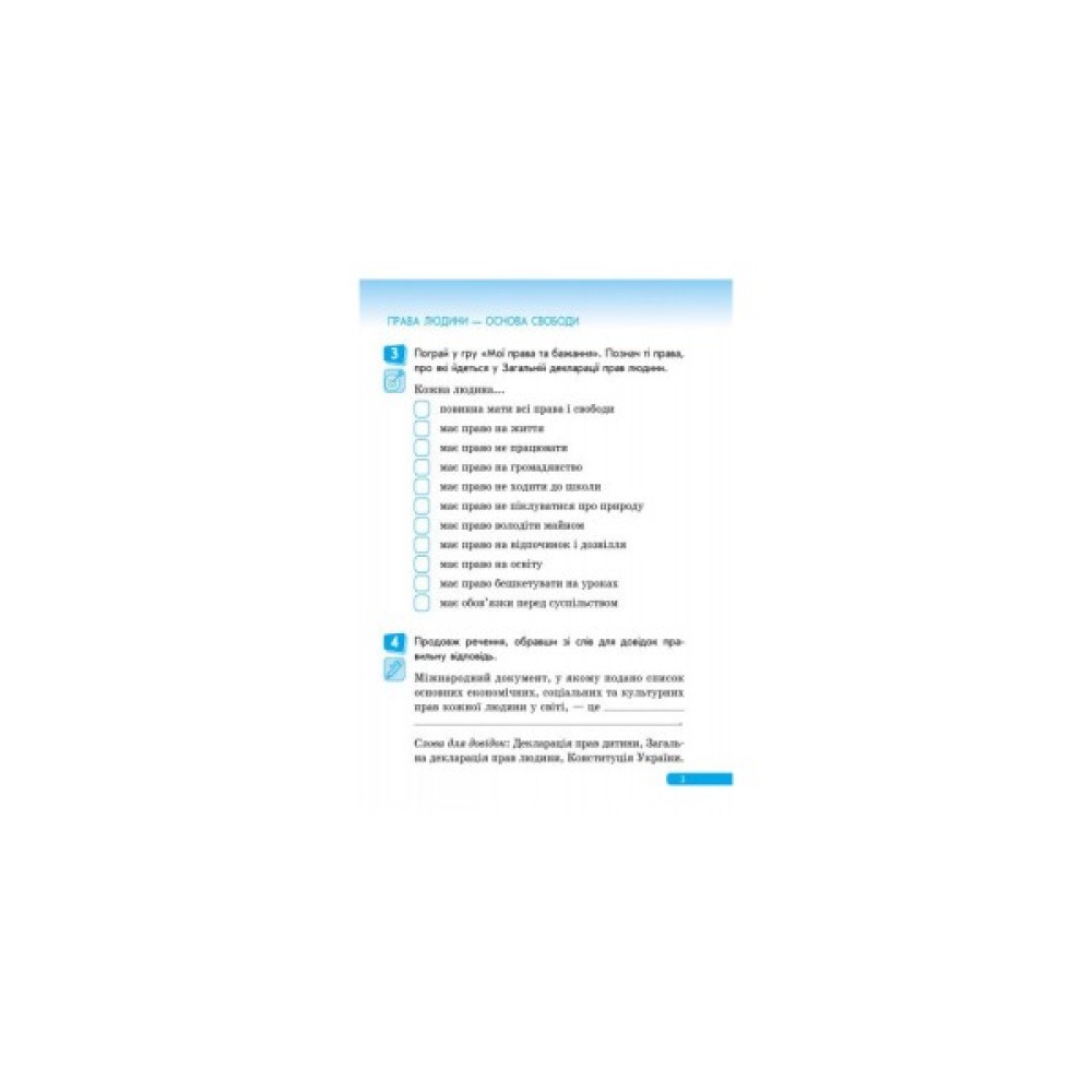 На сторінках зошита учні виконують цікаві завдання, малюють і розфарбовують, грають, розшифровують коди, відгадують загадки. А допомагають їм дізнатися про права людини герої улюблених казок.