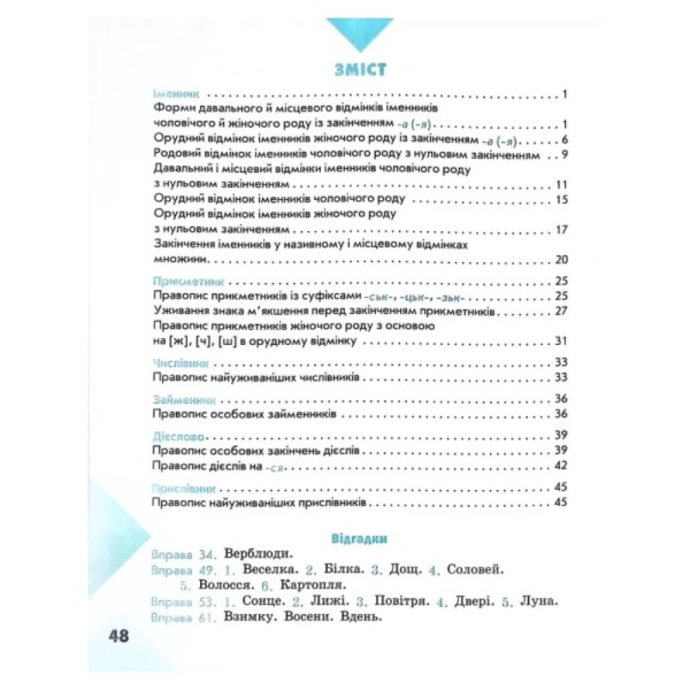 У посібнику автори пропонують вправи й завдання, спрямовані на формування мовленнєвої компетенції учнів 4-го класу: користуватися орфографічним словником для перевірки закінчень іменників чоловічого роду на приголосний у родовому відмінку, відображати на письмі явища чергування приголосних [г], [к], [х] із [з'], [ц'], [с'] та голосного [і] з [е], [о].