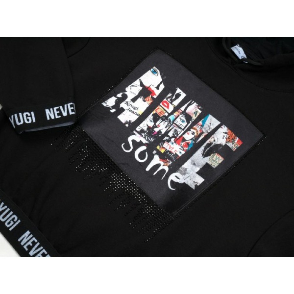 Модна, трикотажна толстовка з капюшоном (худі) гладко-чорного кольору, прикрашена об'ємною барвистою атласною аплікацією, в оточенні блискучих дрібних чорних страз – Must-Have для кожної модної та стильної дівчинки!