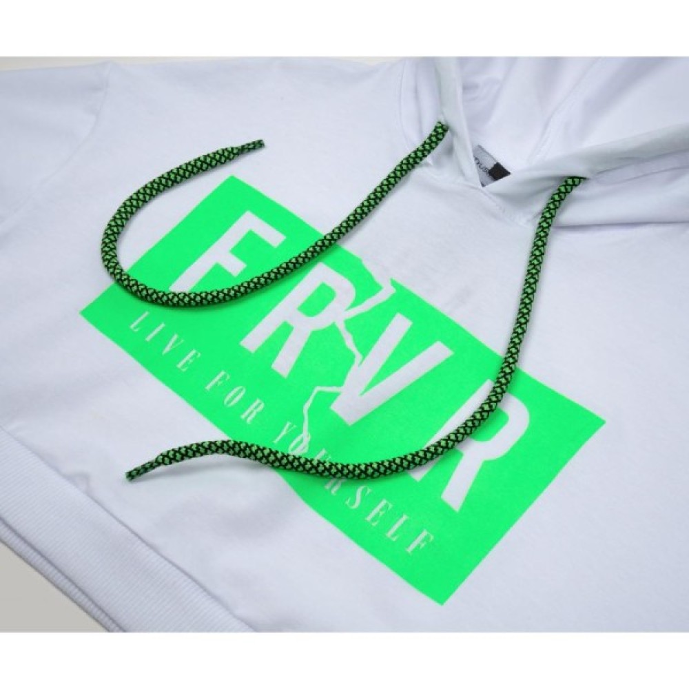 Дуже модна, зручна, не сковуюча рухів, білосніжна укорочена кофта - худі з капюшоном, прикрашена на грудях яскравим, стильним неоново-салатовим принтом - Must-Have для всіх юних модниць!
