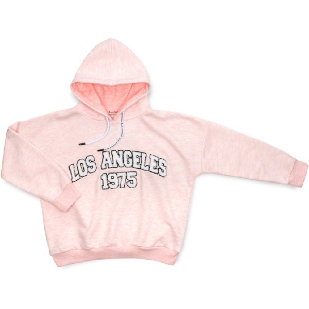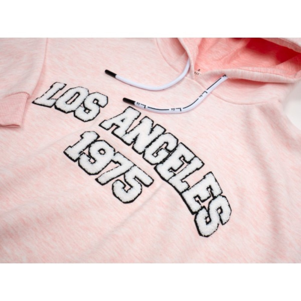 Ефектна, вільна трикотажна кофта - худі персикового меланжевого кольору , з капюшоном і об'ємною вишивкою «LOS ANGELES 1975», фасон оверсайз, для вашої юної модниці.