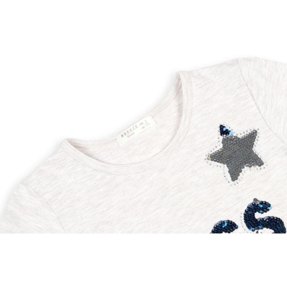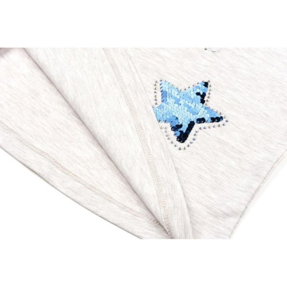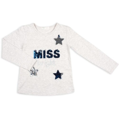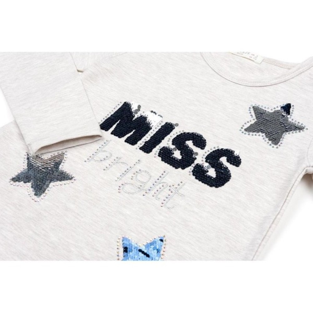 Гарний лонгслів бежевого меланжевого кольору, злегка розширеного А - образного силуету з круглою горловиною, окантованою трикотажною бейкою, і довгим рукавом. Лінія низу злегка заокруглена. Спереду прикрашена настроченим написом «MISS» з паєток, які перевертаються і вишитим шовковими нитками словом «BRIGHT». Додатковою прикрасою на поличці служать зірочки з таких само паєток, що змінюють колір з синього на сріблястий. Обрамлені навколо блискучими кристалами. Відмінний дизайн, м'який трикотаж в поєднанні з відмінною якістю пошиття! Напевно кофточка стане улюбленицею в гардеробі Вашої юної модниці.