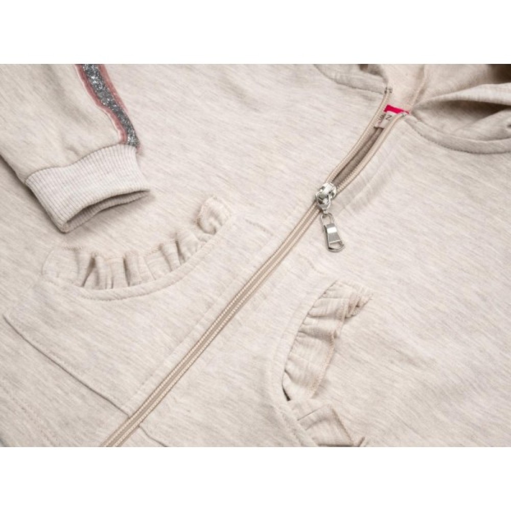 Застібається на якісну капронову блискавку з металевим бігунком. Капюшон одинарний. Рукава суцільнокроєні на манжетах з еластичної, подвійної трикотажної гумки відмінної якості. Прикрашені ефектними блискучими сріблястими вертикальними лампасами.  Спереду виконані накладні скошені кишені. Вхід в кишені прикрашений призібраними трикотажними рюшами.