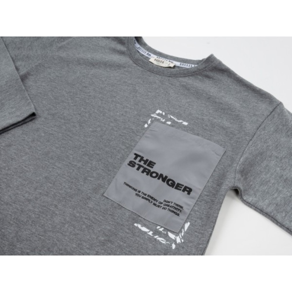 - Ефектний трикотажний вільний лонгслів прямого силуету, з нагрудною накладною кишенею та довгими рукавами, прикрашений акуратним контрастним стильним принтовим накатом.