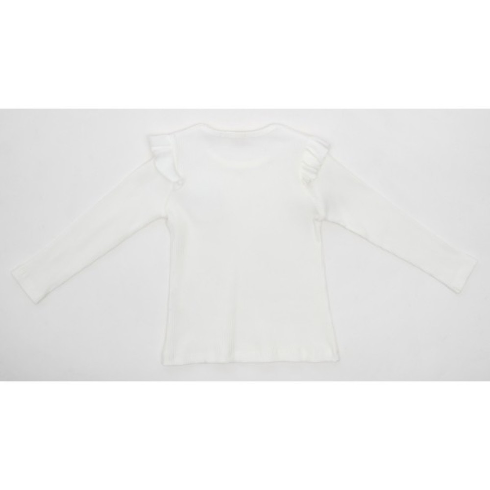 - Лонгслів прикрашений по окату рукавів гарненькими оборочками-крильцями з основного трикотажу, а на грудях - м'якенькою квіточкою-аплікацією.