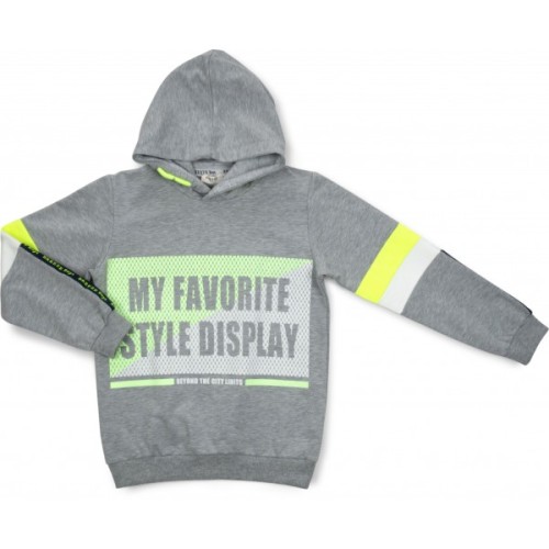 Зручна, не сковуюча рухи, меланжева спортивна кофта - худі з капюшоном, приємного світло-сірого кольору, прикрашена яскравим об'ємним принтом в неоново-салатовому і білому кольорах.