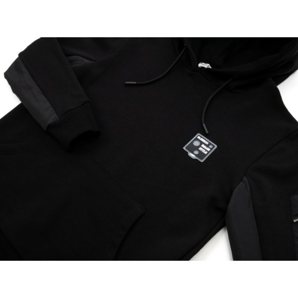 Манжети рукавів та низ худі оброблені щільною, якісною, подвійною трикотажною гумкою. Рукави в худі комбіновані, з внутрішньої сторони нашита плащова тканина. На лівому рукаві є маленька кишенька на блискавці.