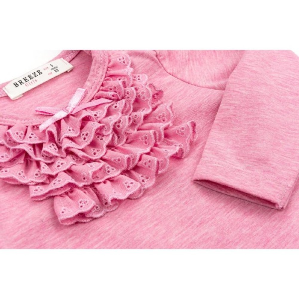 Ошатна модель, приємна на дотик, спереду прикрашена красивими, настроченими в п'ять рядів, мереживними рюшами в тон лонгсліва (мереживо - шиття) і милим атласним бантиком по центру горловини. Рукав довгий, прісборенний по окату. Еластична кругла горловина, оформлена ніжною трикотажною бейкою, м'який трикотаж і застібка на лівому плечі на два фірмові гудзика полегшать процес надягання. Для додаткової прикраси моделі, в лівому нижньому кутку пришитий сріблястий логотип фірми «BREEZE» в оточенні кристаликів.