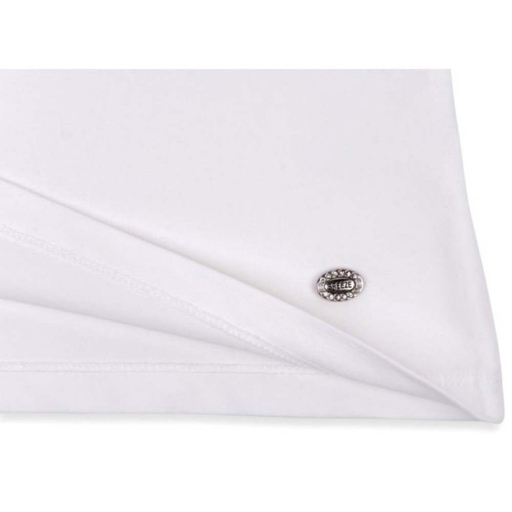 Виріз горловини класичний, круглий, зібраний на м'яку резинку. По лінії горловини прикрашений широкою (12 см) вишитою х/б оборкою. Красива, дуже акуратно виконана, вишивка х/б нитками по ситцю в техніці «рішельє», надає цій моделі милий вигляд. Рукава довгі, без манжет. Спереду в лівому нижньому кутку - невеликий фірмовий металевий логотип зі стразиками.