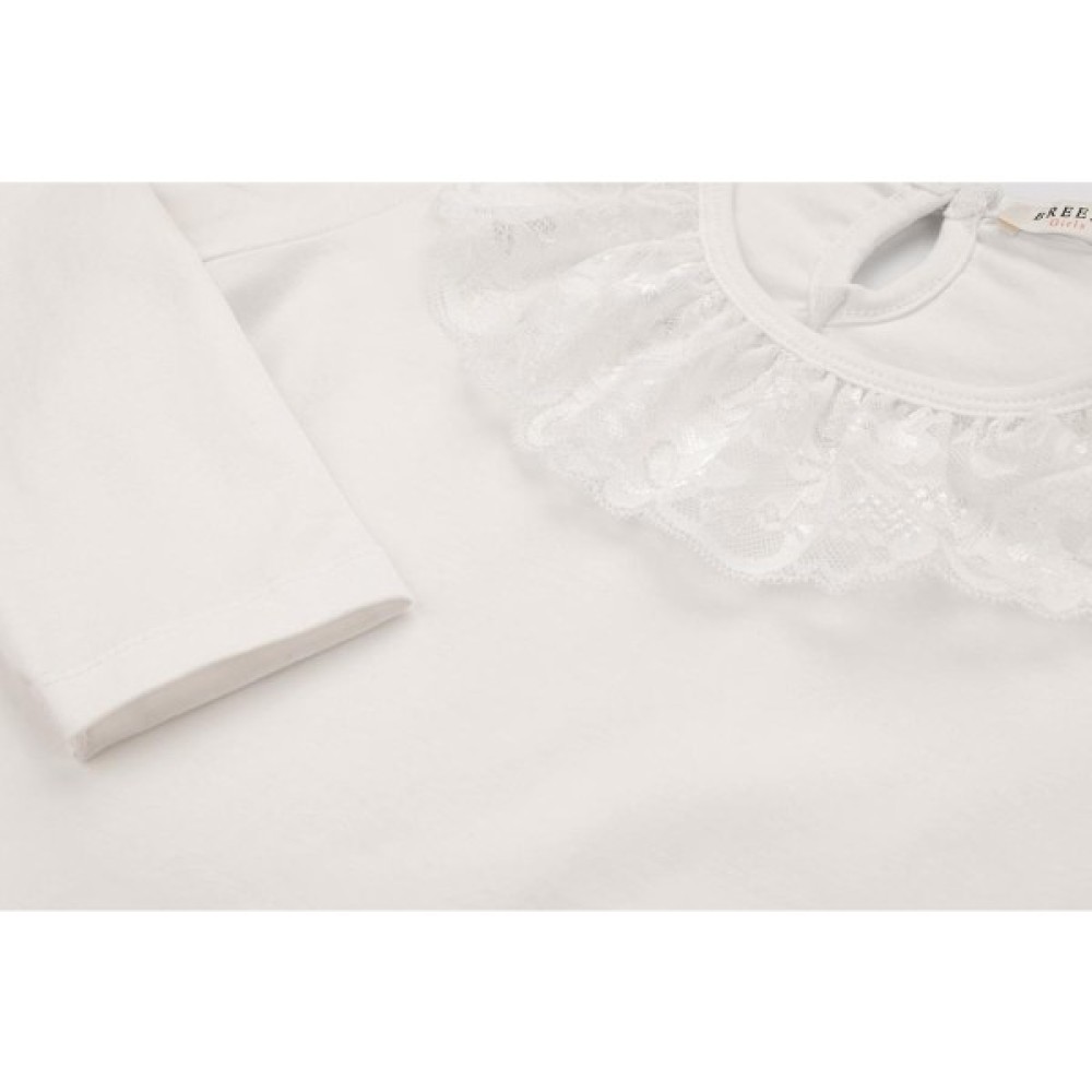 Чудова модна модель А - образного силуету з довгим рукавом, приємного кремового кольору, виконана з м'якого, якісного, турецького бавовняного трикотажу, з додаванням невеликого % еластану для підтримки форми. Верхня і нижня частини блузки прикрашені оборкою з ніжного перламутрового гіпюру. Овальна горловина окантована еластичною трикотажною бейкою.