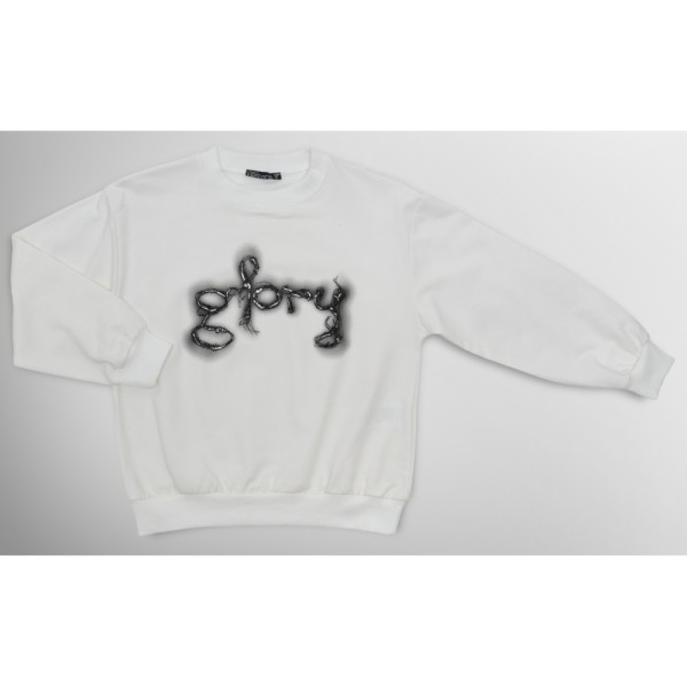 - Модний, вільний трикотажний світшот оверсайз молочно-білого кольору з довгими рукавами для дівчинки, прикрашений ефектним монохромним принтовим малюнком та з детальним металізованим сріблястим напиленням.