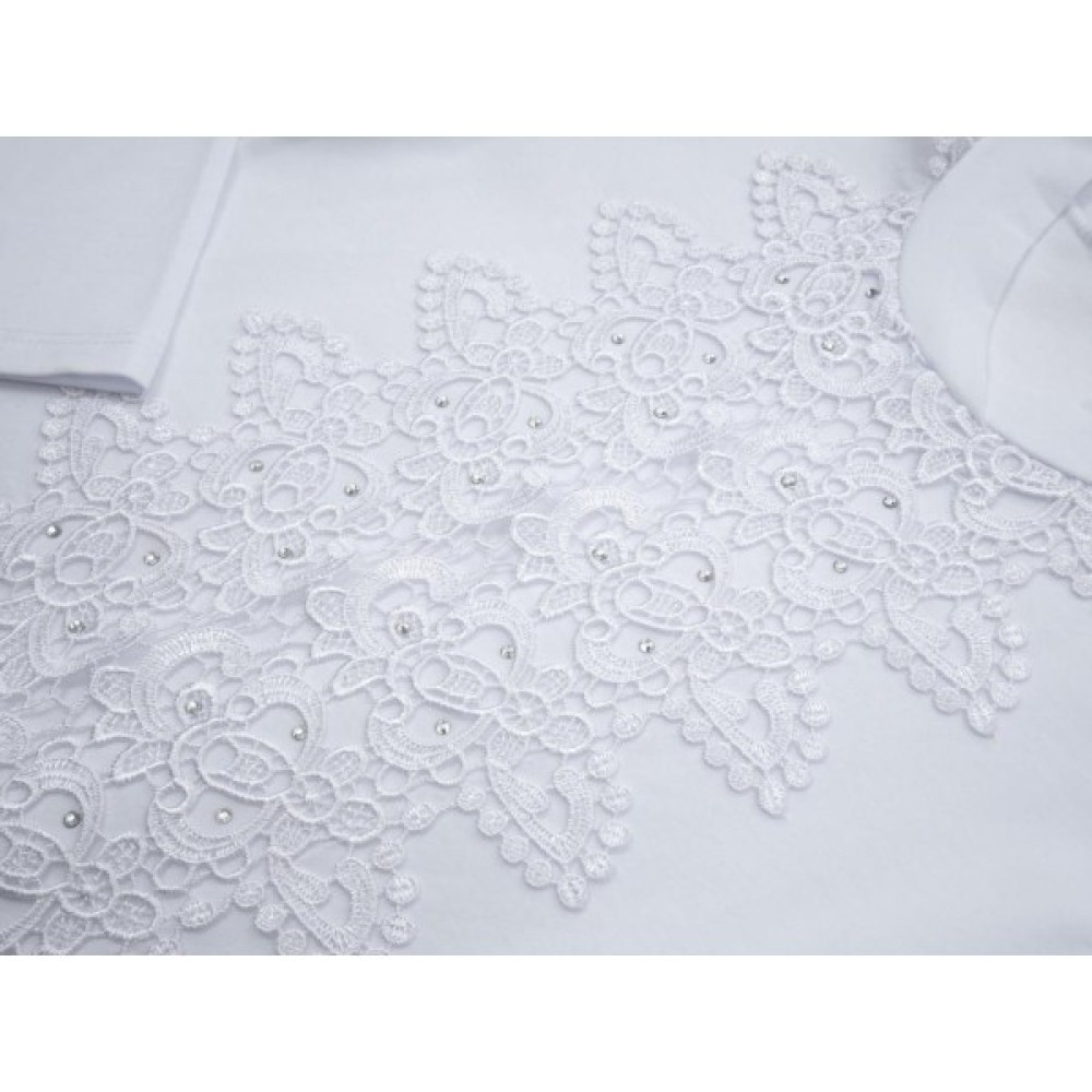 Кофточка прикрашена широкою смугою красивого, настроченого поверх полички шикарного мережива-макраме і розсипом сріблястих страз.