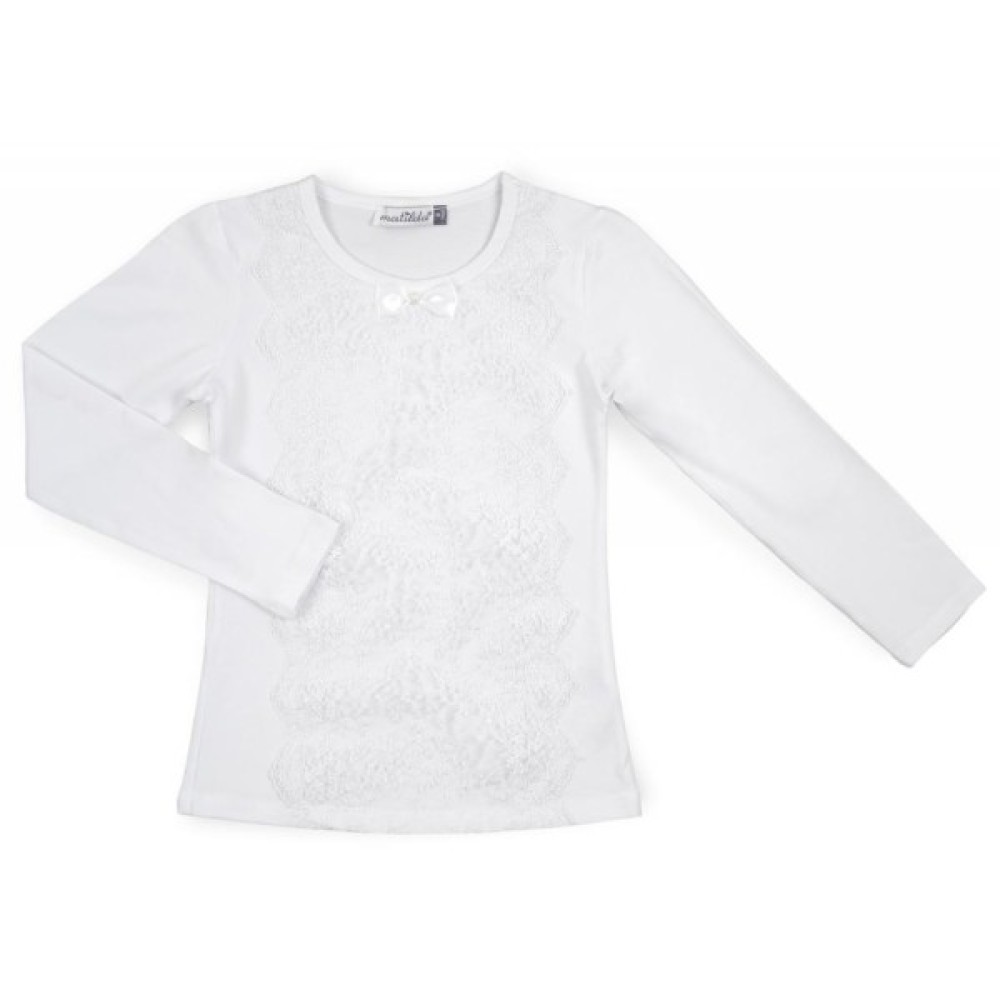 Ошатна модель трохи розширеного А - силуету білого кольору. Рукав довгий, трохи звужений до низу. Прикрашена кофточка красивим мереживом, настроченим поверх полички і маленьким атласним бантиком посередині горловини.